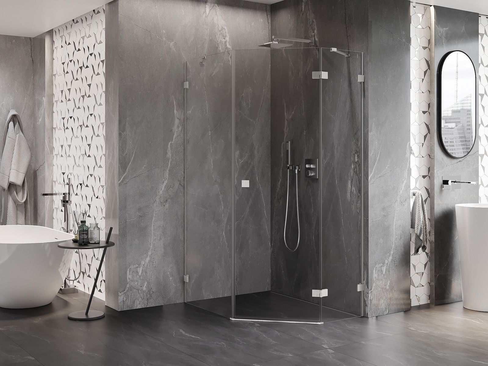 Poręczny i wygodny uchwyt został wykonany z trwałego i odpornego metalu. Modny kształt w połączeniu z wykończeniem dopasowanym do koloru profili nadaje całości nowoczesnego i stylowego wyglądu, podkreślając estetykę każdej łazienki.