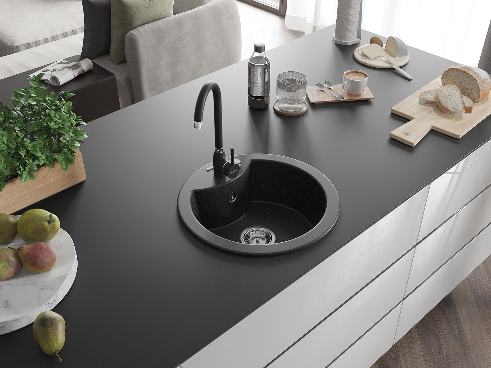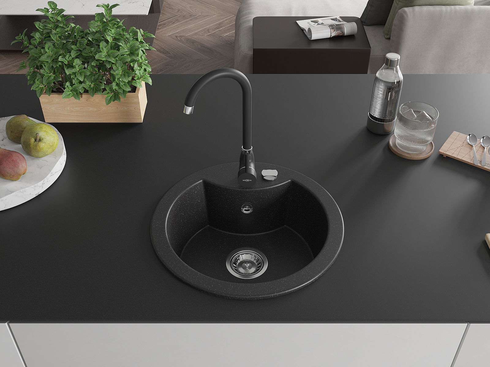 Zlew posiada podfrezowany otwór o średnicy 35 mm do samodzielnego wybicia. Można go wykorzystać m.in. do montażu dozownika na płyn, który wyeliminuje obecność plastikowych butelek w kuchni i nada jej eleganckiego wykończenia.