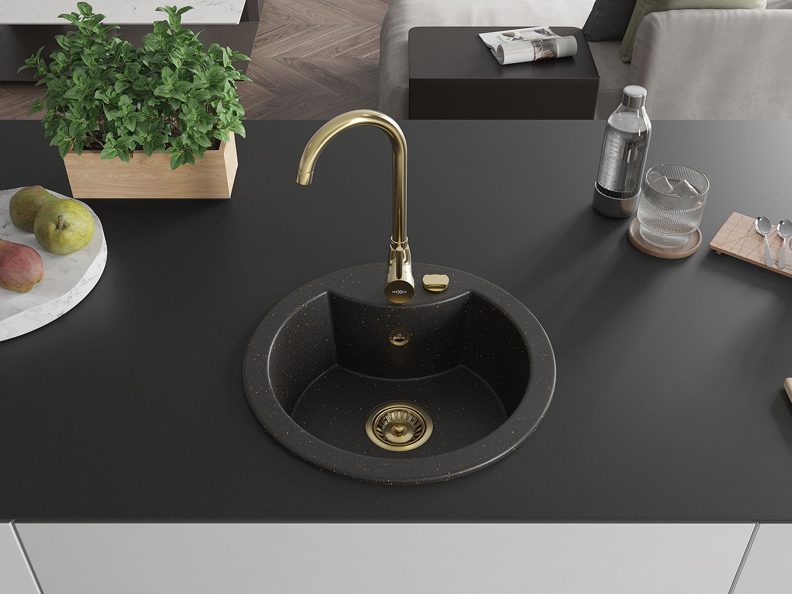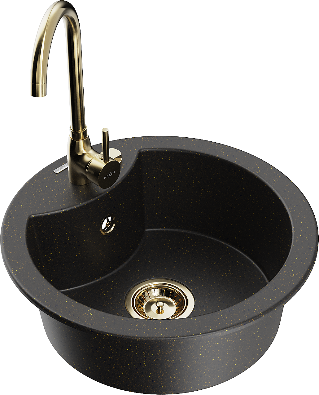 Mexen Diego zlewozmywak granitowy 1-komorowy z baterią kuchenną Telma, czarny/złoty - 6512-75-670200-50