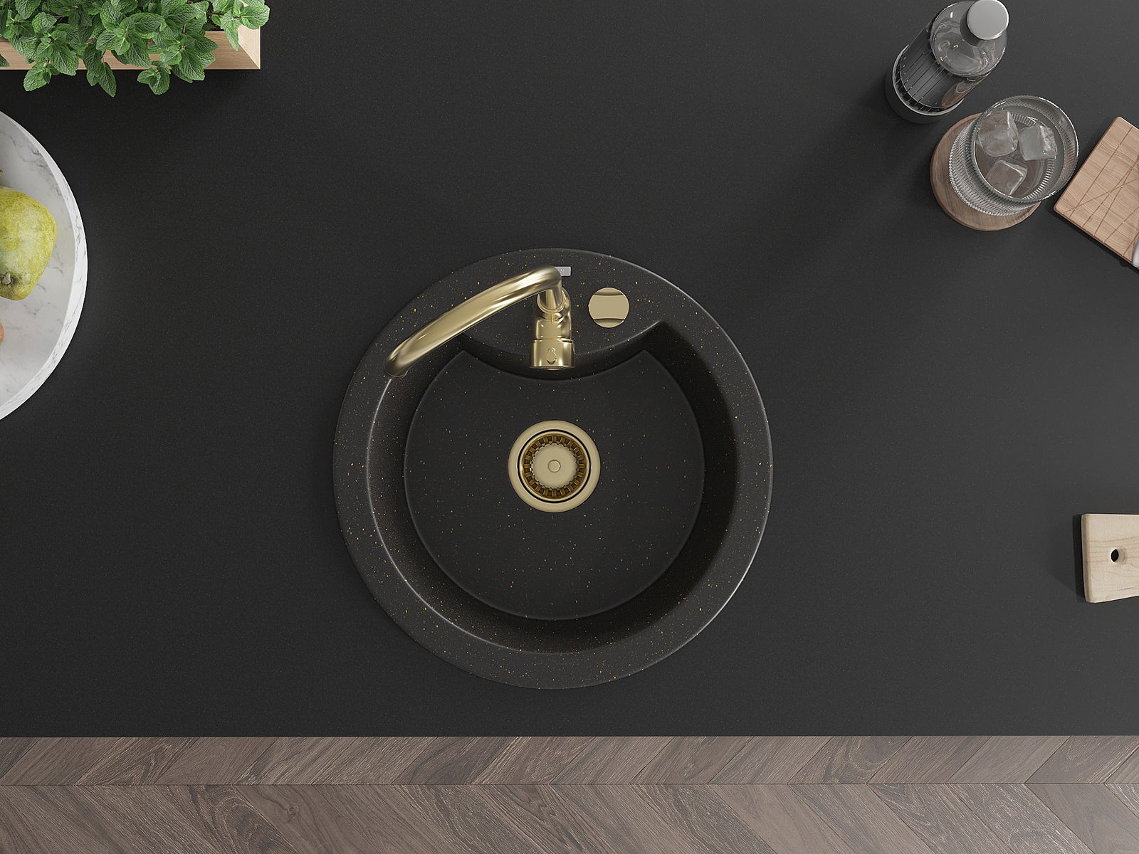 Zlew posiada podfrezowany otwór o średnicy 35 mm do samodzielnego wybicia. Można go wykorzystać m.in. do montażu dozownika na płyn, który wyeliminuje obecność plastikowych butelek w kuchni i nada jej eleganckiego wykończenia.