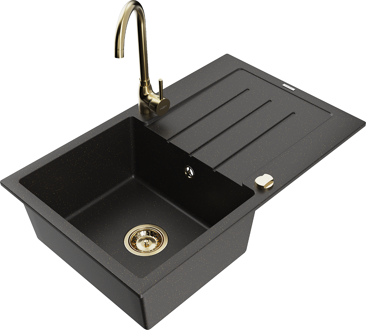 Mexen Bruno zlewozmywak granitowy 1-komorowy z ociekaczem i baterią kuchenną Telma, czarny/złoty - 6513-75-670200-50