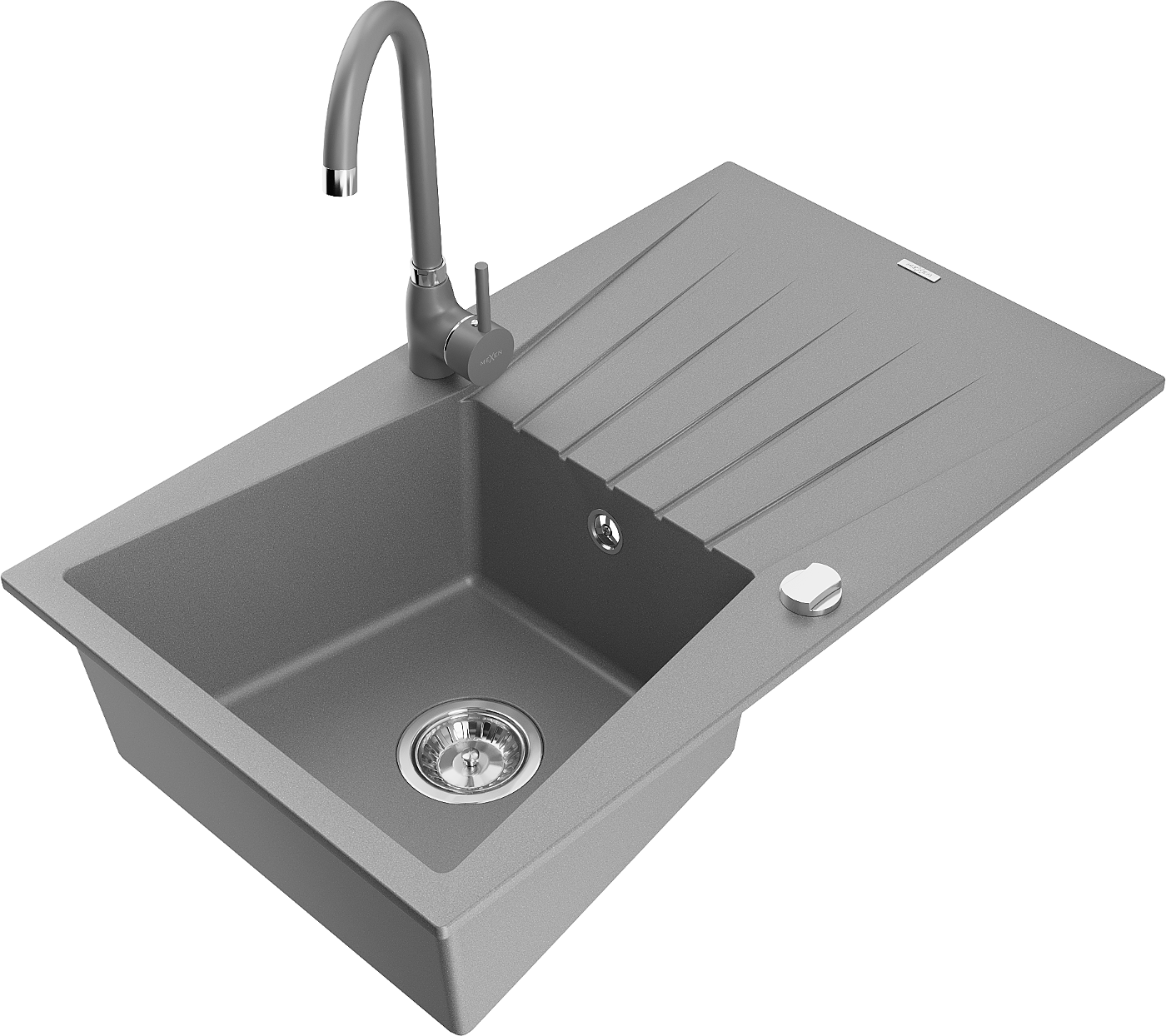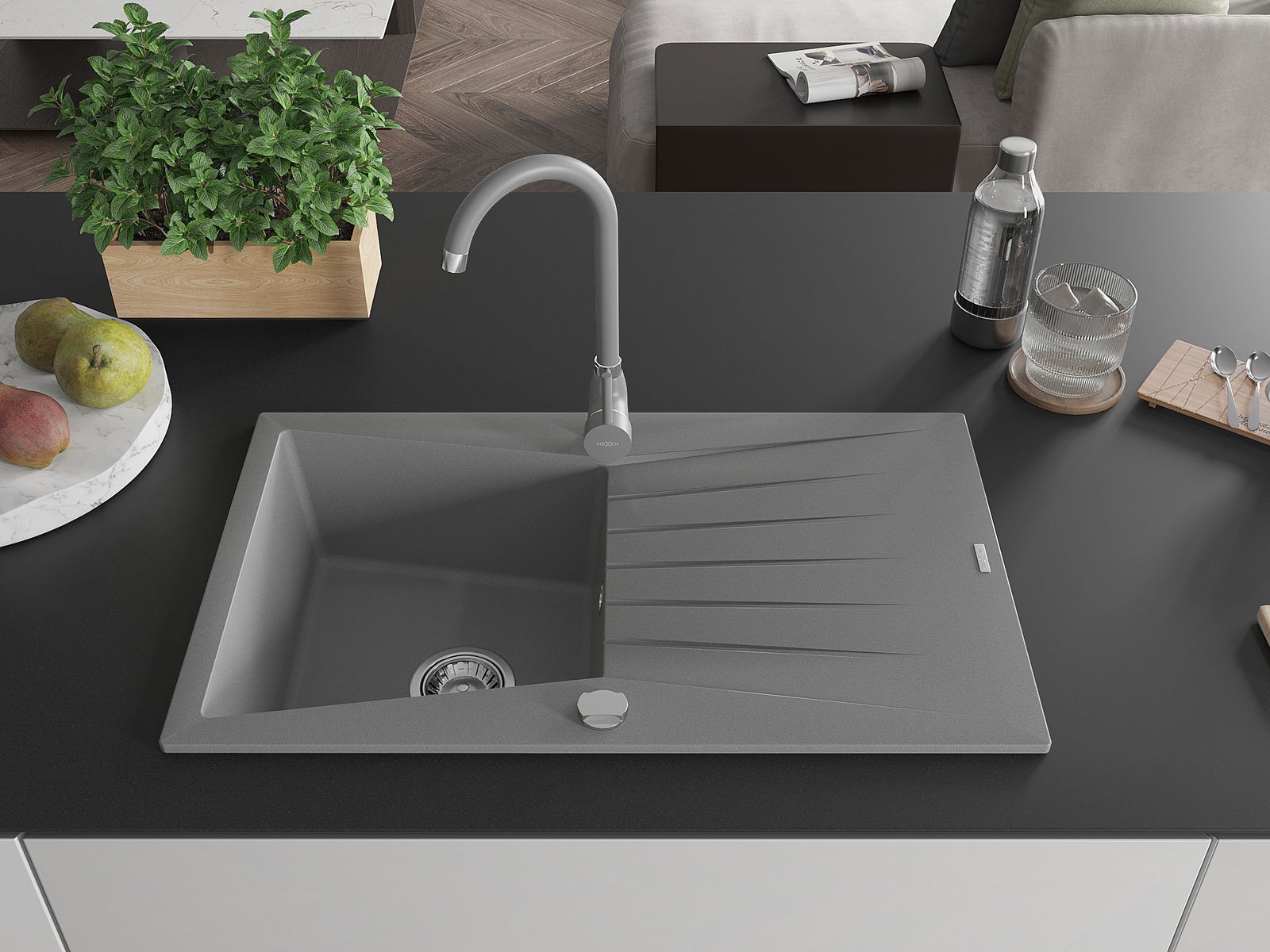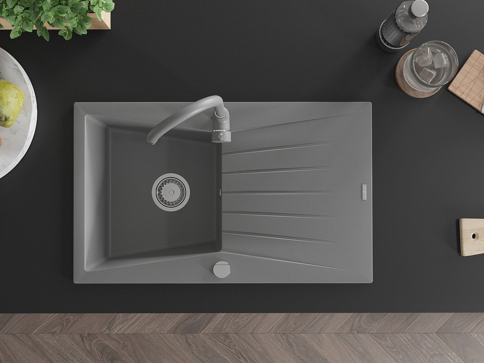 Mexen Cesar zlewozmywak granitowy 1-komorowy z ociekaczem i baterią kuchenną Telma, szary - 6514-71-670200-71