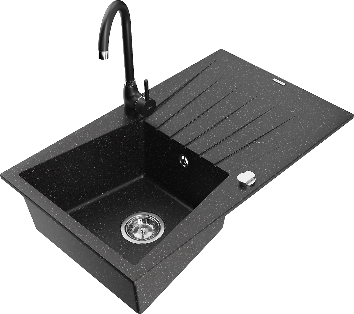 Mexen Cesar zlewozmywak granitowy 1-komorowy z ociekaczem i baterią kuchenną Telma, czarny/srebrny - 6514-73-670200-70