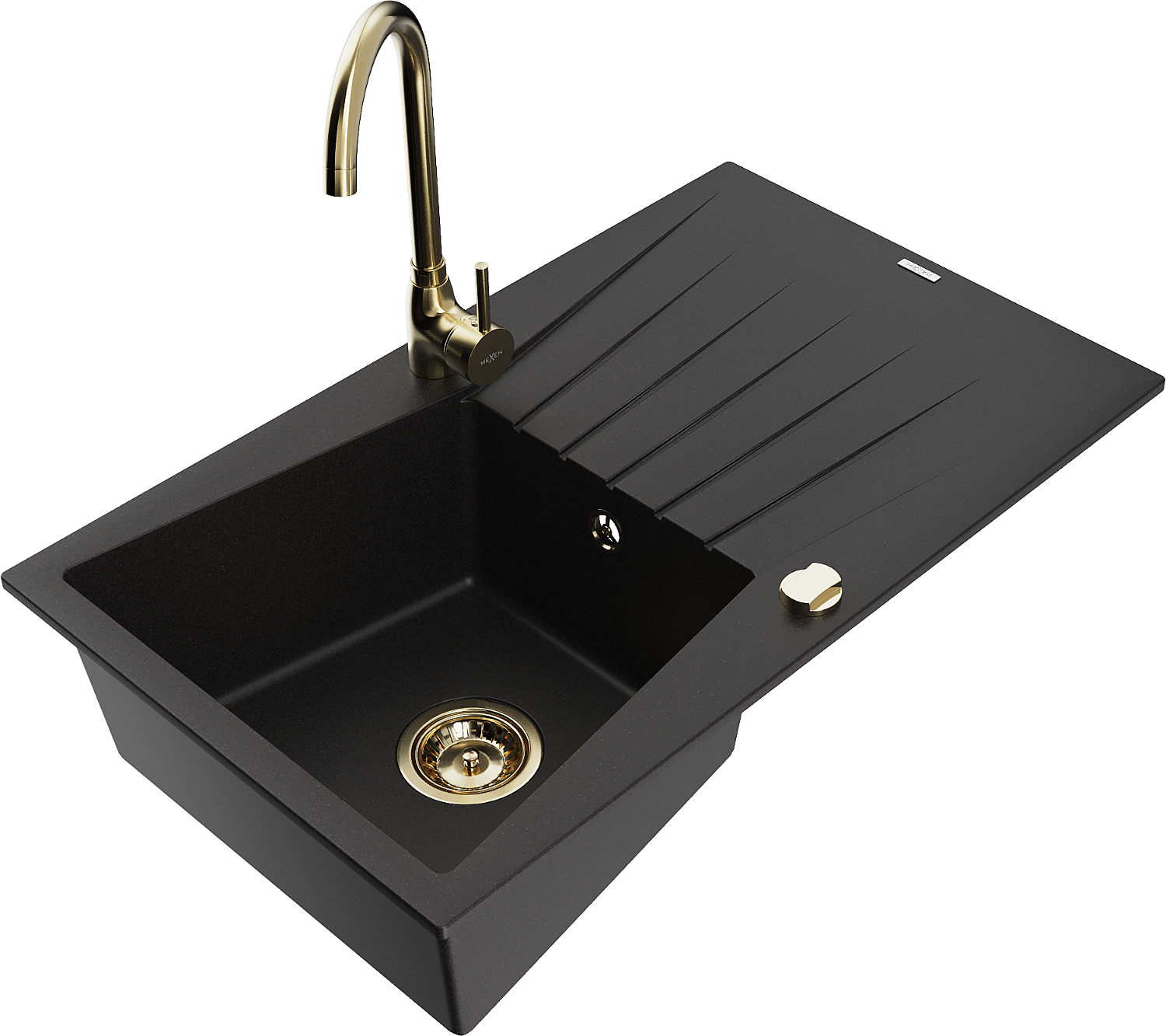 Mexen Cesar zlewozmywak granitowy 1-komorowy z ociekaczem i baterią kuchenną Telma, czarny - 6514-77-670200-50