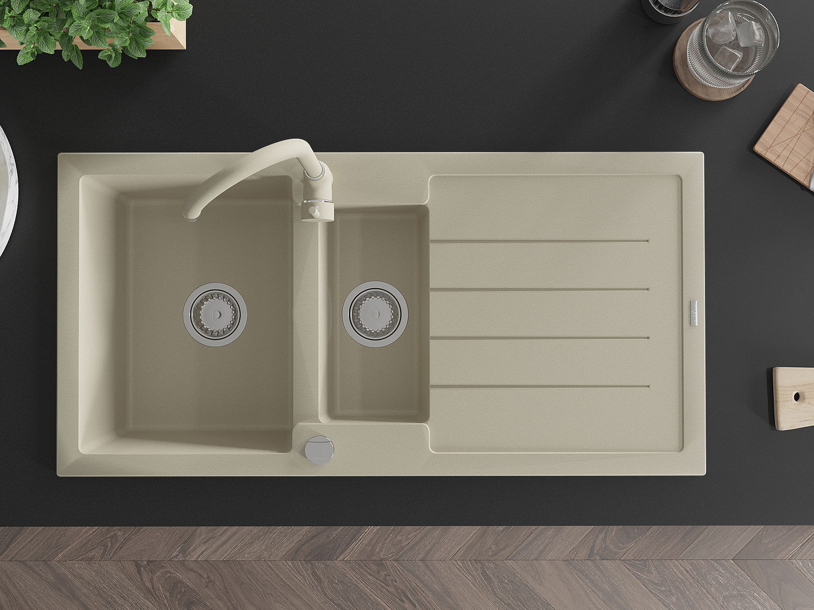 Mexen Andres zlewozmywak granitowy 1,5-komorowy z ociekaczem i baterią kuchenną Telma, beżowy - 6515-69-670200-69