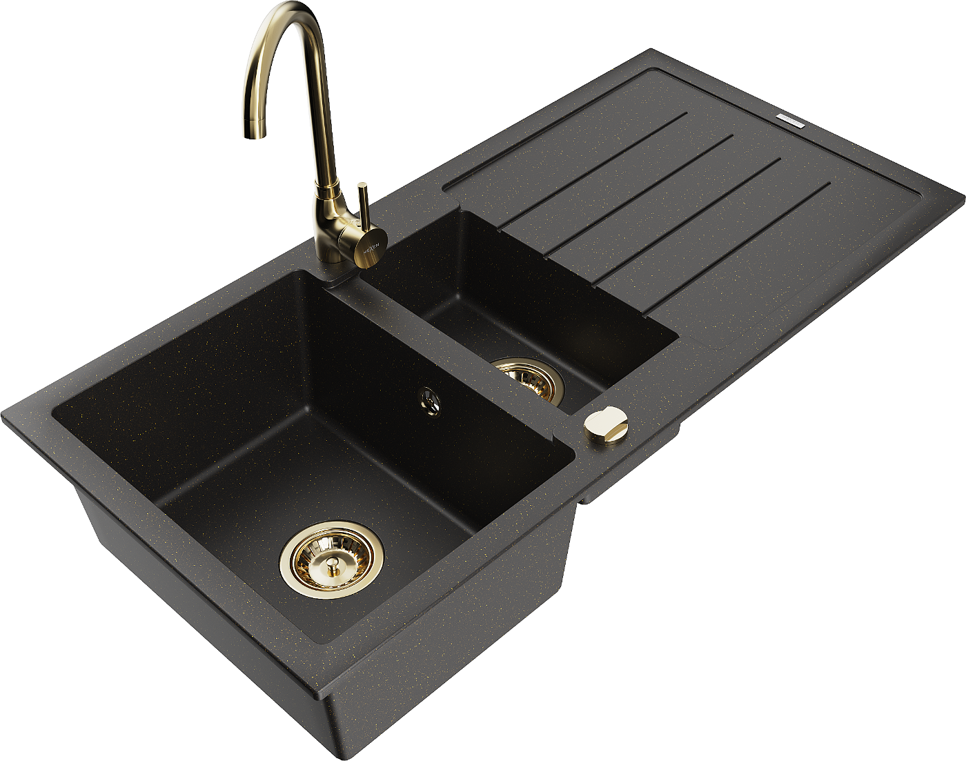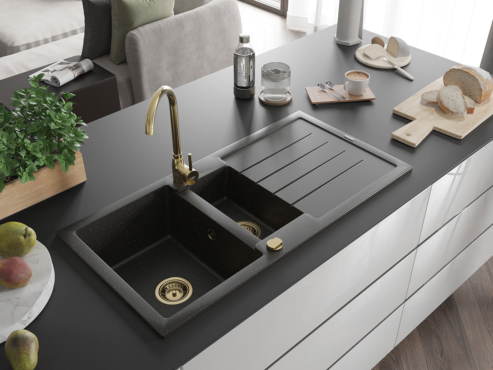 Mexen Andres zlewozmywak granitowy 1,5-komorowy z ociekaczem i baterią kuchenną Telma, czarny/złoty - 6515-75-670200-50