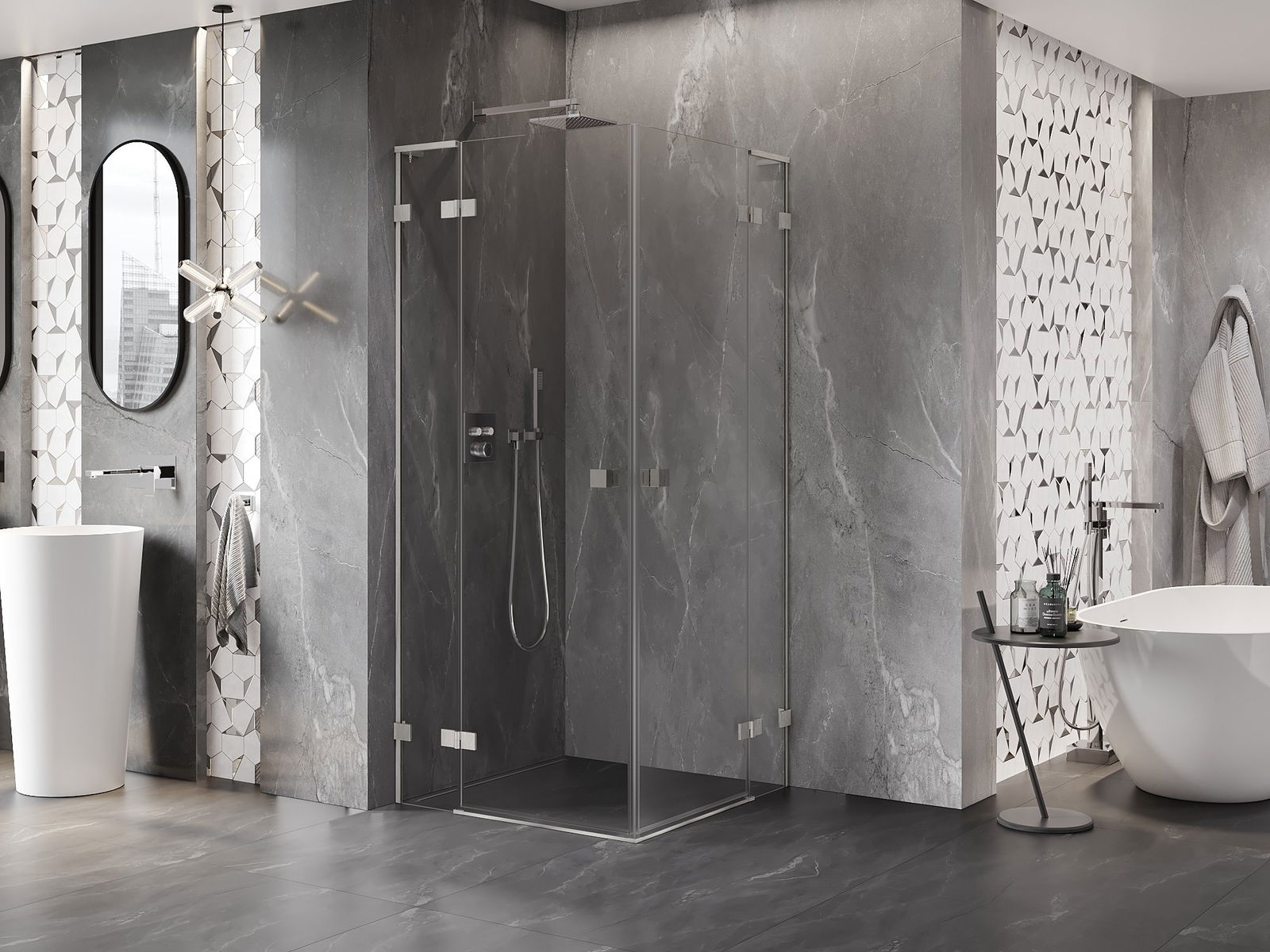Poręczny i wygodny uchwyt został wykonany z trwałego i odpornego metalu. Modny kształt w połączeniu z wykończeniem dopasowanym do koloru profili nadaje całości nowoczesnego i stylowego wyglądu, podkreślając estetykę każdej łazienki.
