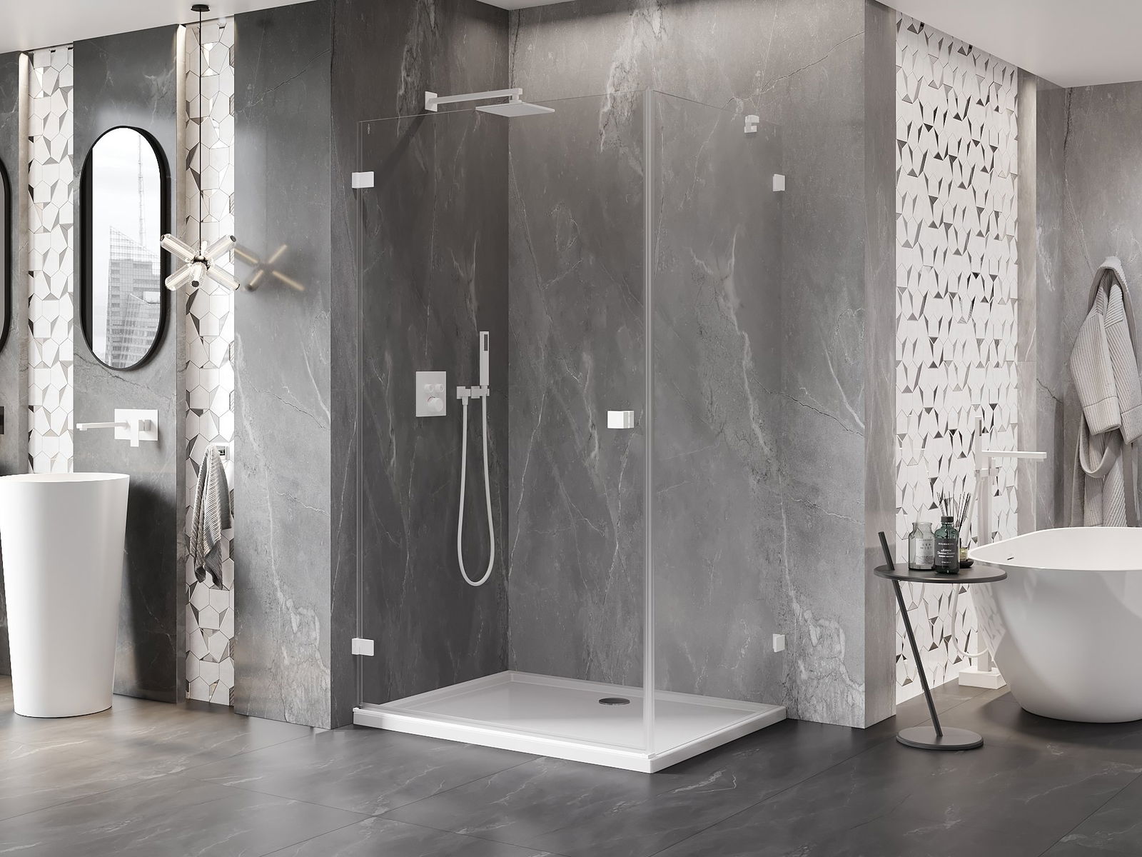Poręczny i wygodny uchwyt został wykonany z trwałego i odpornego metalu. Modny kształt w połączeniu z wykończeniem dopasowanym do koloru profili nadaje całości nowoczesnego i stylowego wyglądu, podkreślając estetykę każdej łazienki.