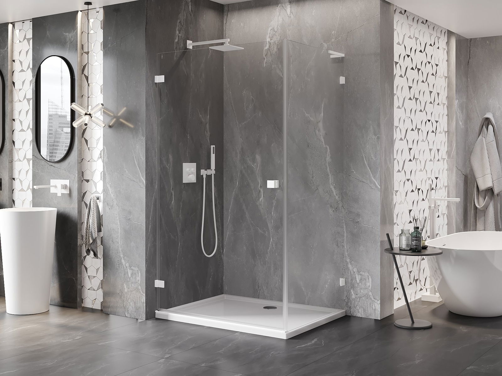 Poręczny i wygodny uchwyt został wykonany z trwałego i odpornego metalu. Modny kształt w połączeniu z wykończeniem dopasowanym do koloru profili nadaje całości nowoczesnego i stylowego wyglądu, podkreślając estetykę każdej łazienki.