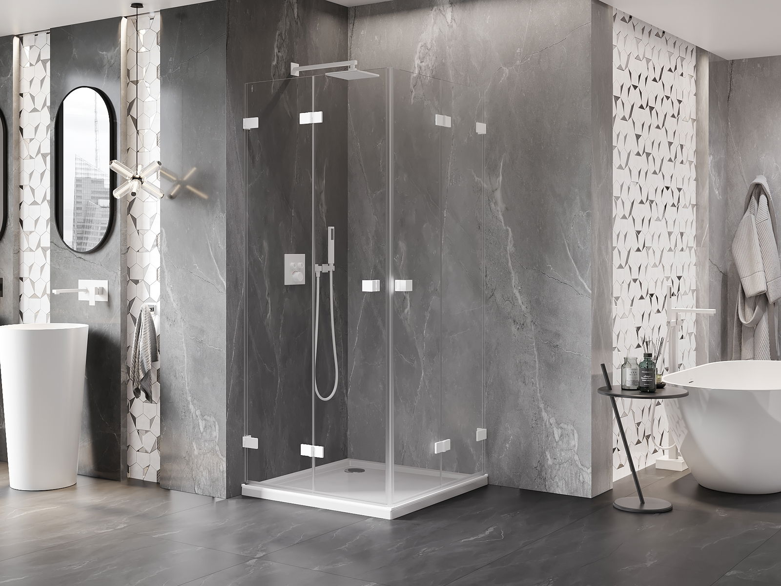 Możliwość składania drzwi, zarówno do zewnątrz, jak i do wewnątrz, pozwala uzyskać więcej przestrzeni podczas niekorzystania z prysznica. Jest to idealne rozwiązanie do mniejszych łazienek, maksymalnie wykorzystujące dostępną powierzchnię.