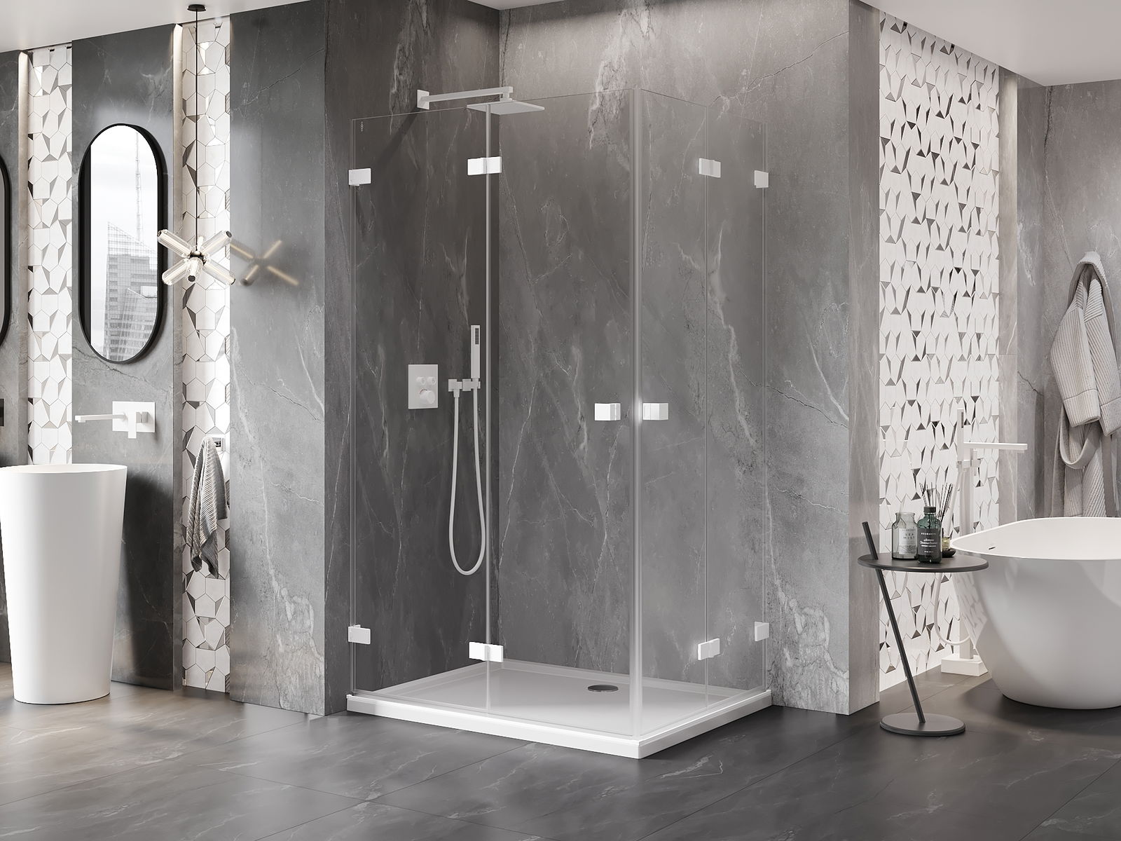 Możliwość składania drzwi, zarówno do zewnątrz, jak i do wewnątrz, pozwala uzyskać więcej przestrzeni podczas niekorzystania z prysznica. Jest to idealne rozwiązanie do mniejszych łazienek, maksymalnie wykorzystujące dostępną powierzchnię.