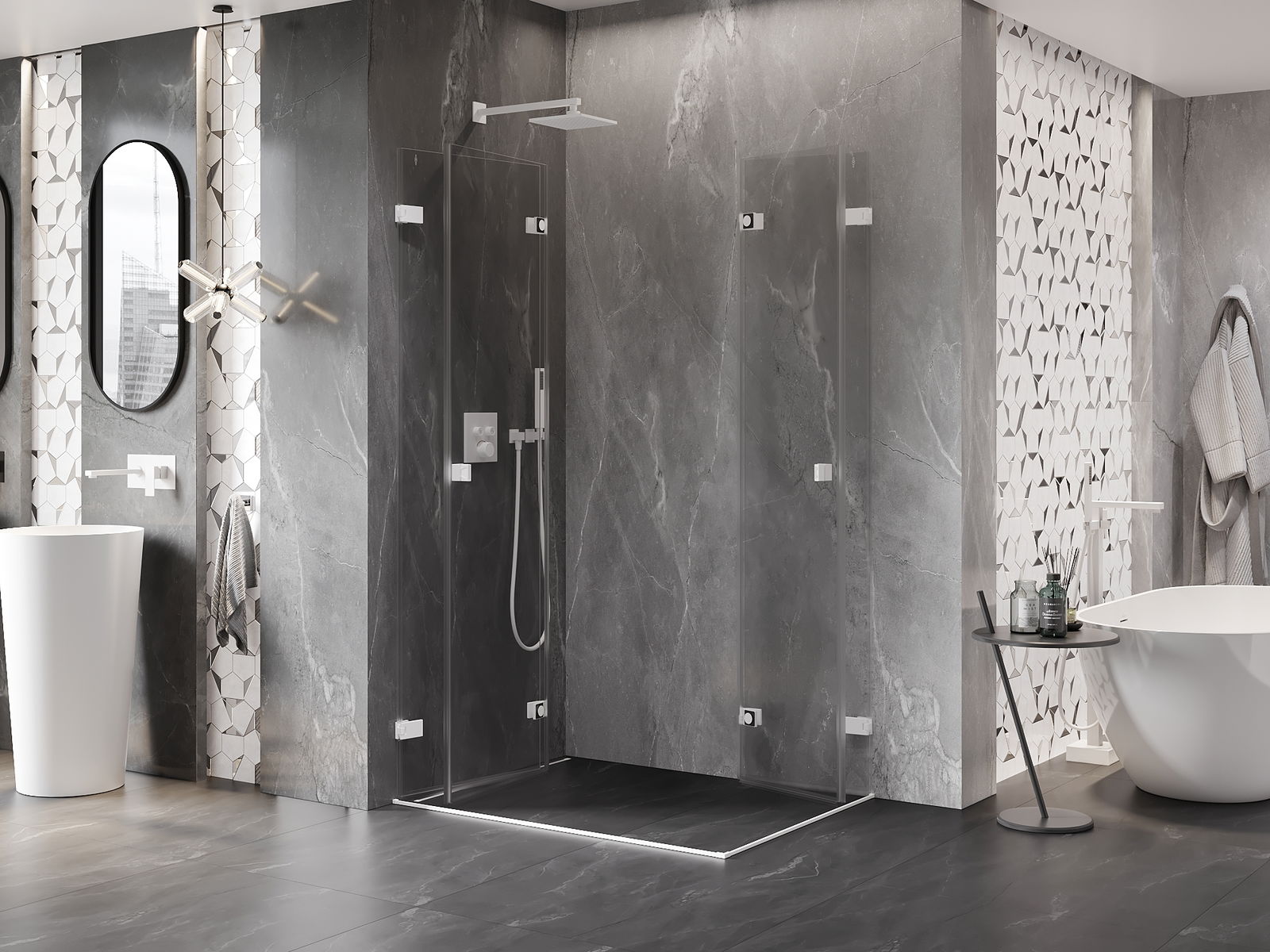 Możliwość składania drzwi, zarówno do zewnątrz, jak i do wewnątrz, pozwala uzyskać więcej przestrzeni podczas niekorzystania z prysznica. Jest to idealne rozwiązanie do mniejszych łazienek, maksymalnie wykorzystujące dostępną powierzchnię.