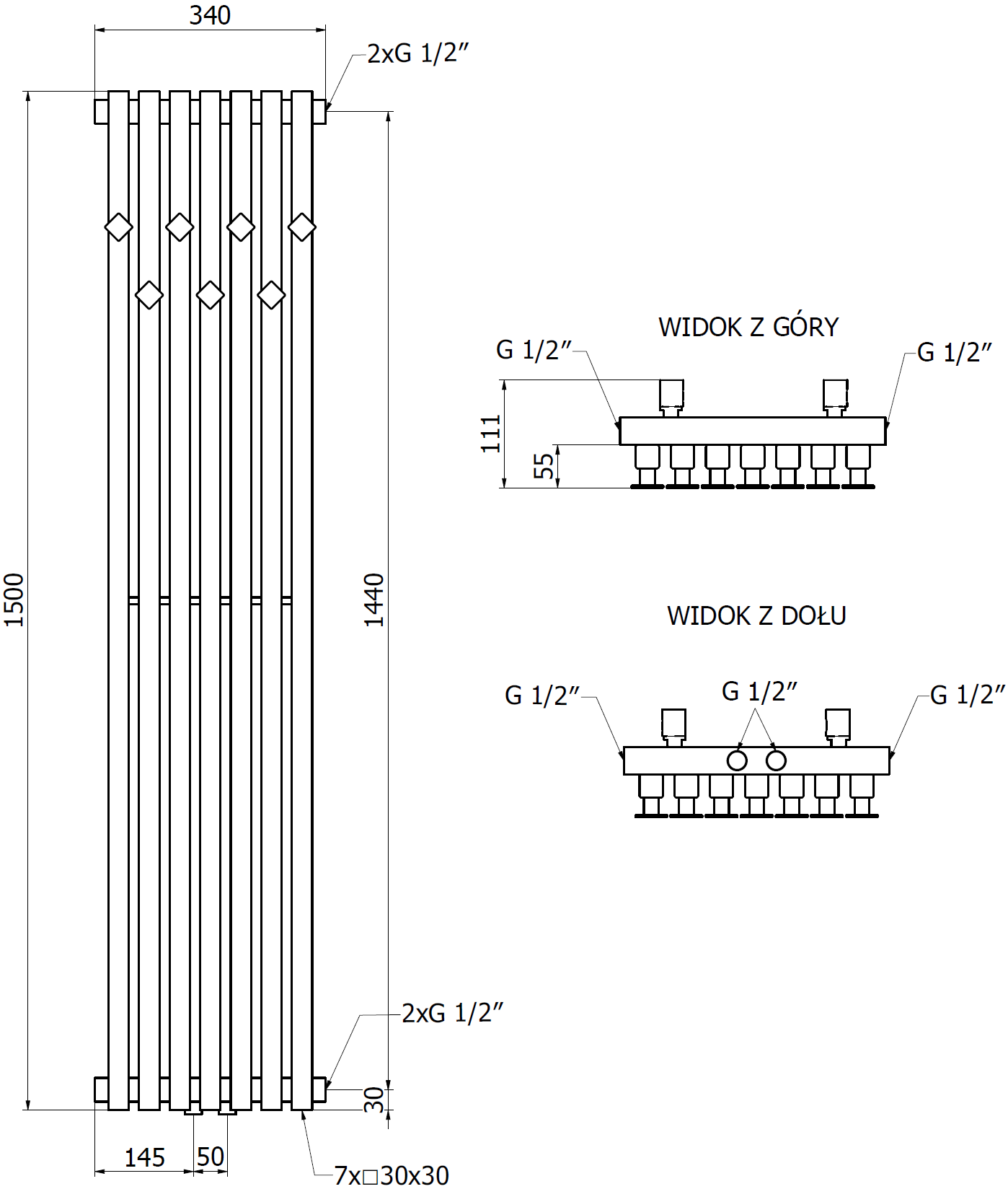 Dane techniczne: Wysokość: 1500 mm Szerokość: 340 mm Głębokość: 102 mm Rozstaw podłączenia: -  144 cm (boczne) lub 5 cm (środkowe) Kolor: Antracyt RAL 7016 Materiał: Stal Waga: 13,16 kg Reakcja na ogień: A1 Temperatura pracy: max 95 °C  Maksymalne ciśnienie robocze: 0,6 Mpa Moc grzewcza: - 75/65/20 °C - 630 W Przyłącza: - 2xG ½″ środkowe - 4xG ½″ od góry oraz dołu z prawej lub lewej strony Ilość wieszaków na ręcznik: 7 Wysokiej jakości, trwała powłoka lakiernicza odporna na korozję W komplecie: zawieszenia, zestaw montażowy, korki zaślepiające oraz odpowietrznik