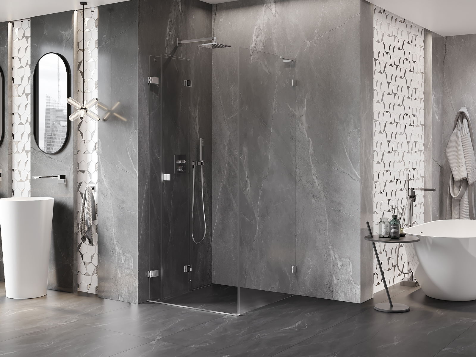 Możliwość składania drzwi, zarówno do zewnątrz, jak i do wewnątrz, pozwala uzyskać więcej przestrzeni podczas niekorzystania z prysznica. Jest to idealne rozwiązanie do mniejszych łazienek, maksymalnie wykorzystujące dostępną powierzchnię.