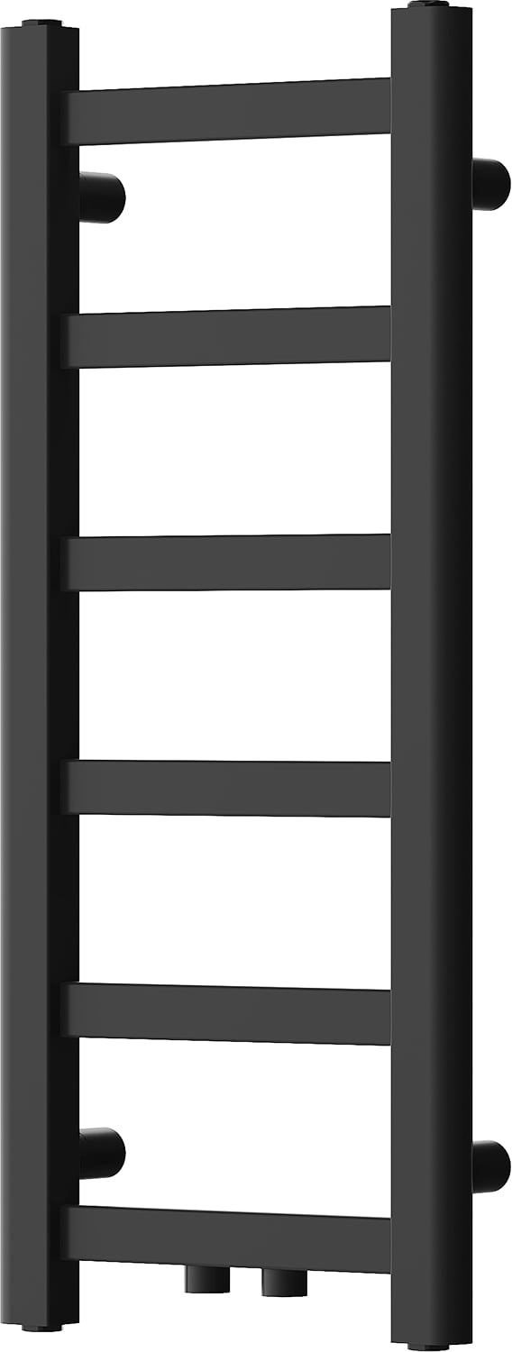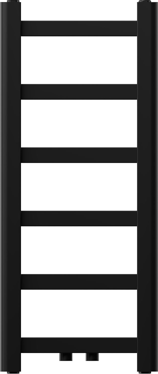 Dane techniczne: Wysokość: 700 mm Szerokość: 300 mm Głębokość: 40 mm Rozstaw podłączenia: - 25 cm (dolne) lub 5 cm (środkowe) Kolor: Czarny RAL 9005 Materiał: Stal Waga: 3,11 kg Reakcja na ogień: A1 Temperatura pracy: max 95 °C  Maksymalne ciśnienie robocze: 0,6 Mpa Moc grzewcza: - 75/65/20 °C - 141 W Przyłącza: - 2xG ½″ środkowe - 4xG ½″ od góry oraz dołu z prawej lub lewej strony Możliwość zamontowania grzałki Wysokiej jakości, trwała powłoka lakiernicza odporna na korozję W komplecie: zawieszenia, zestaw montażowy, korki zaślepiające oraz odpowietrznik Brak możliwości montażu głowicy termostatycznej przy użyciu środkowego podłączenia