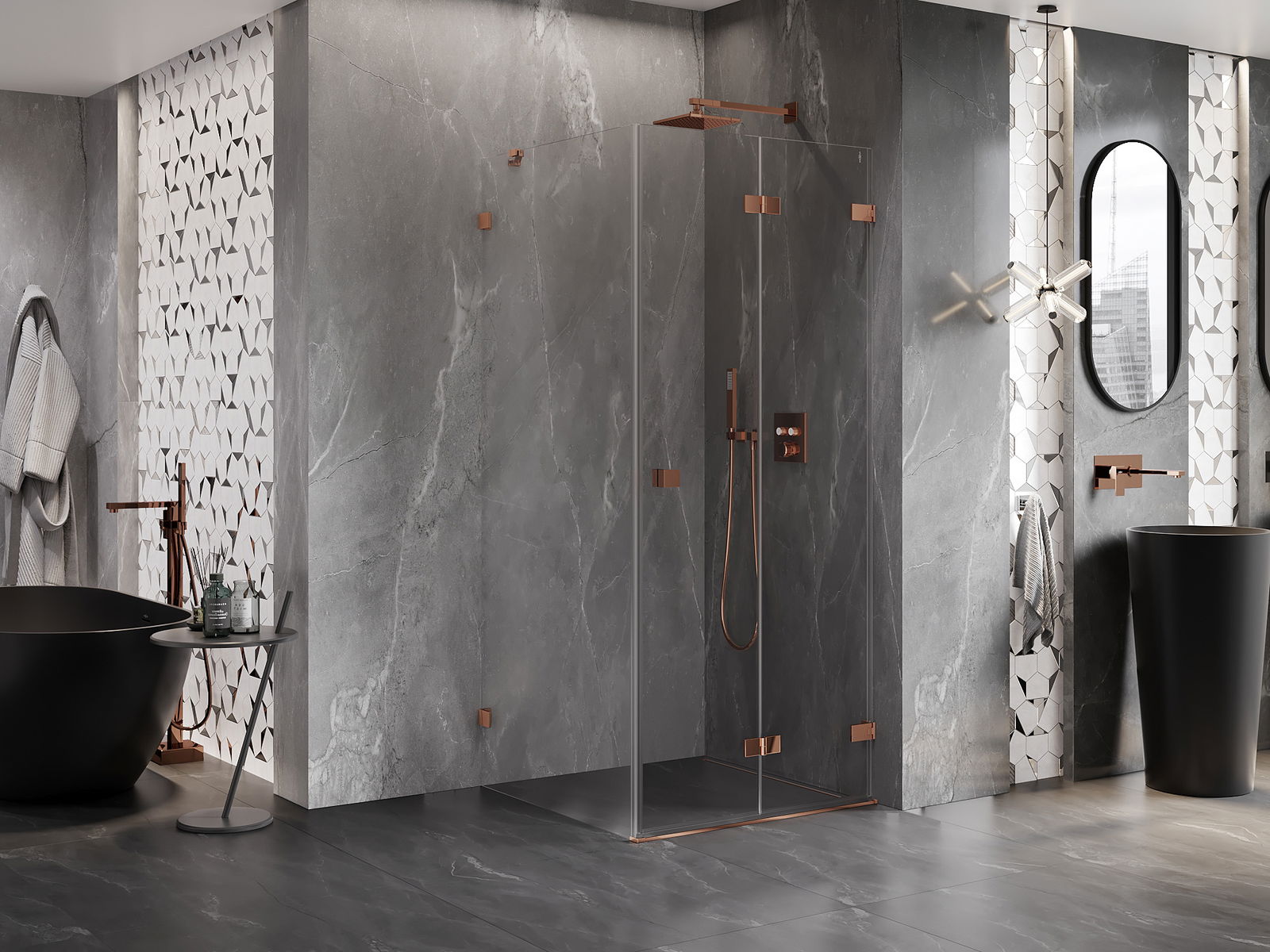 Możliwość składania drzwi, zarówno do zewnątrz, jak i do wewnątrz, pozwala uzyskać więcej przestrzeni podczas niekorzystania z prysznica. Jest to idealne rozwiązanie do mniejszych łazienek, maksymalnie wykorzystujące dostępną powierzchnię.