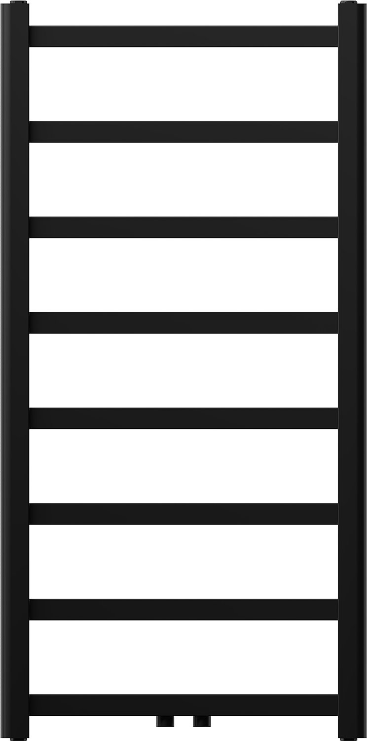 Dane techniczne: Wysokość: 1000 mm Szerokość: 500 mm Głębokość: 40 mm Rozstaw podłączenia: - 45 cm (dolne) lub 5 cm (środkowe) Kolor: Czarny RAL 9005 Materiał: Stal Waga: 5,28 kg Reakcja na ogień: A1 Temperatura pracy: max 95 °C  Maksymalne ciśnienie robocze: 0,6 Mpa Moc grzewcza: - 75/65/20 °C - 259 W Przyłącza: - 2xG ½″ środkowe - 4xG ½″ od góry oraz dołu z prawej lub lewej strony Możliwość zamontowania grzałki Wysokiej jakości, trwała powłoka lakiernicza odporna na korozję W komplecie: zawieszenia, zestaw montażowy, korki zaślepiające oraz odpowietrznik