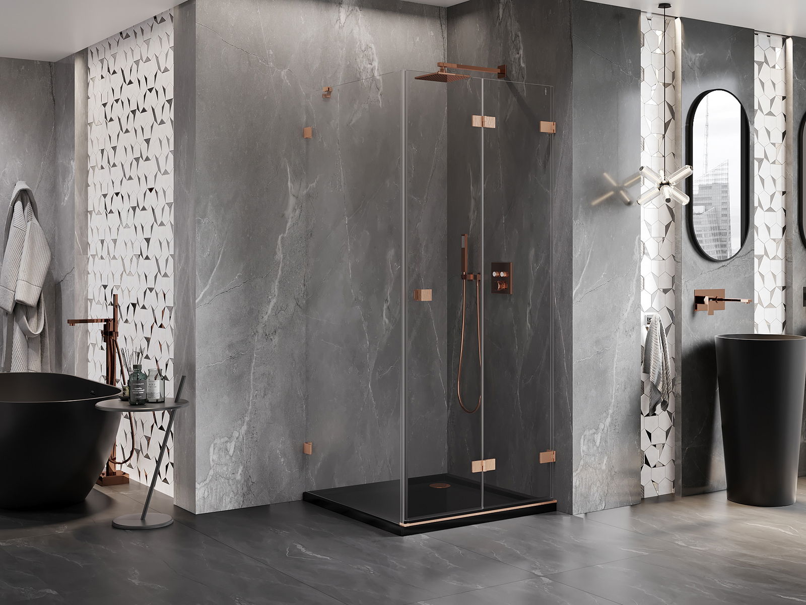 Możliwość składania drzwi, zarówno do zewnątrz, jak i do wewnątrz, pozwala uzyskać więcej przestrzeni podczas niekorzystania z prysznica. Jest to idealne rozwiązanie do mniejszych łazienek, maksymalnie wykorzystujące dostępną powierzchnię.