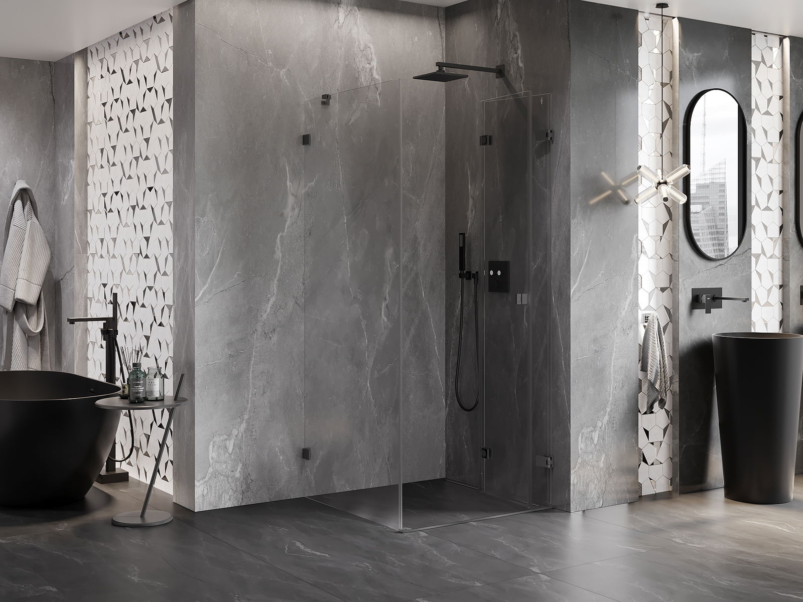 Możliwość składania drzwi, zarówno do zewnątrz, jak i do wewnątrz, pozwala uzyskać więcej przestrzeni podczas niekorzystania z prysznica. Jest to idealne rozwiązanie do mniejszych łazienek, maksymalnie wykorzystujące dostępną powierzchnię.
