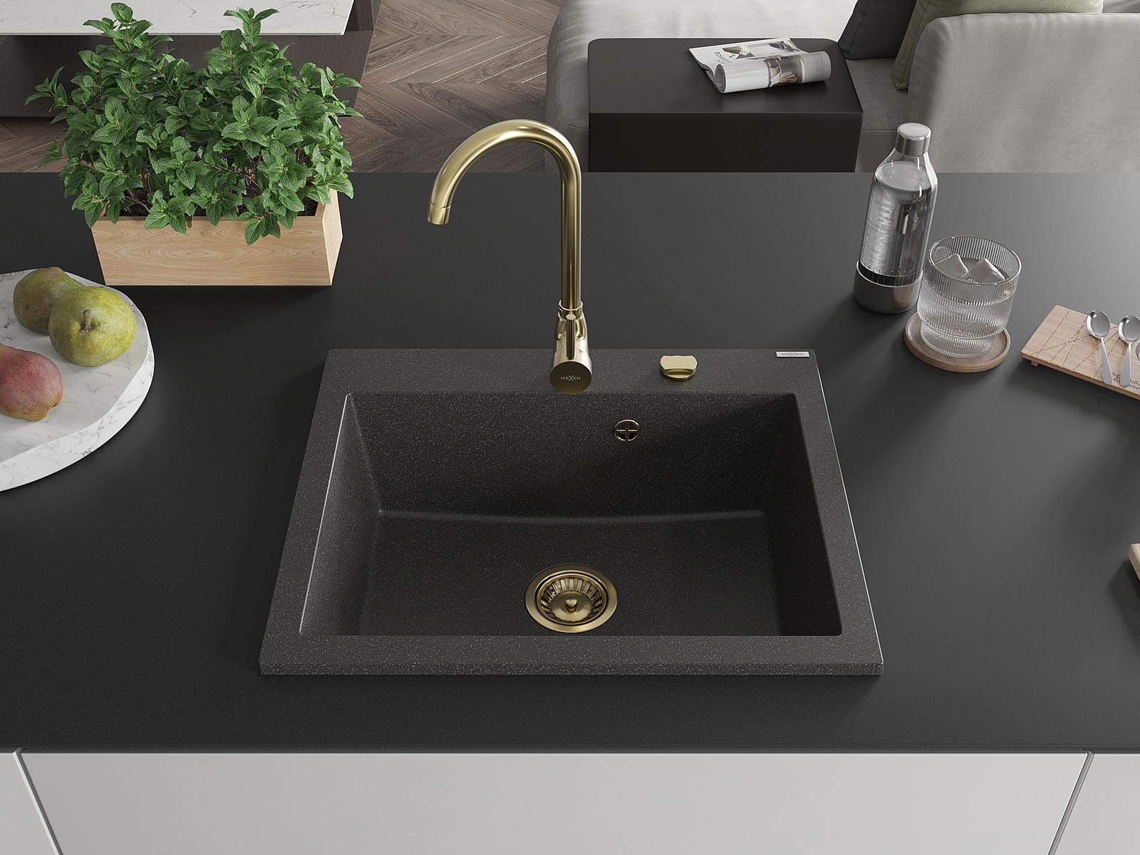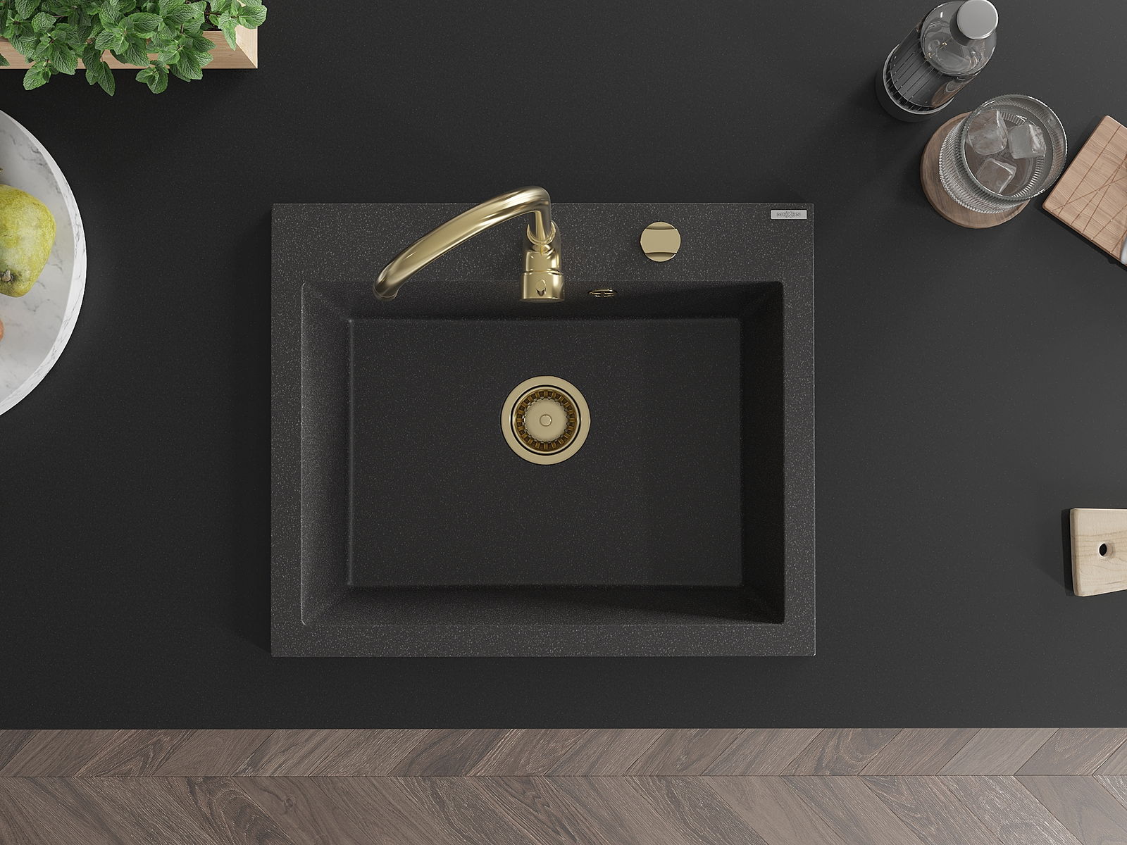 Mexen Elix zlewozmywak granitowy 1-komorowy 600 x 500 mm, czarny nakrapiany, syfon złoty - 6525601005-76-G