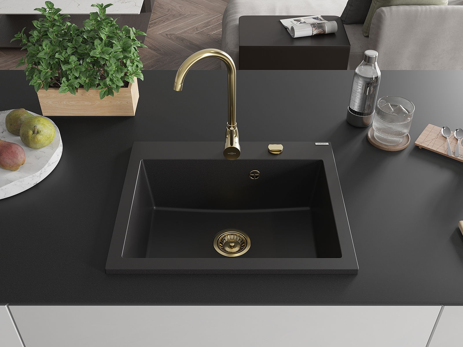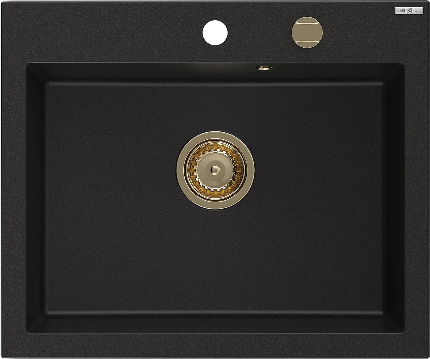 Mexen Elix zlewozmywak granitowy 1-komorowy 600 x 500 mm, czarny, syfon złoty - 6525601005-77-G