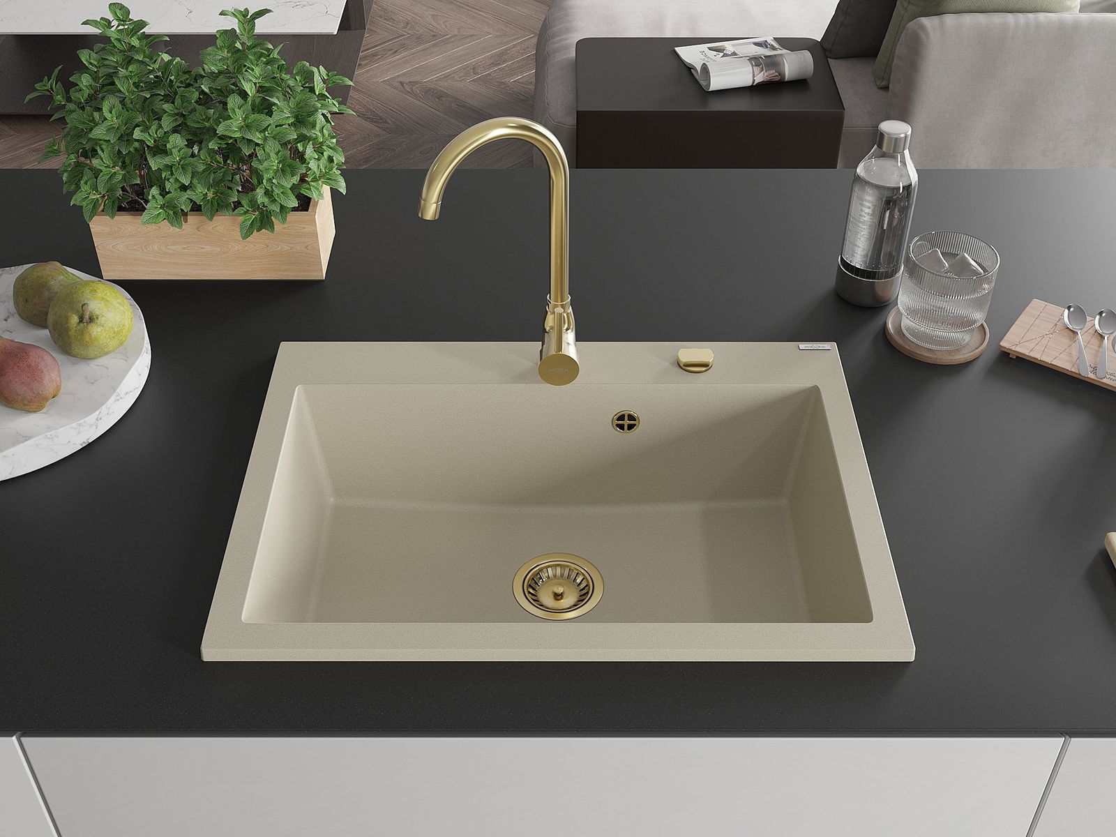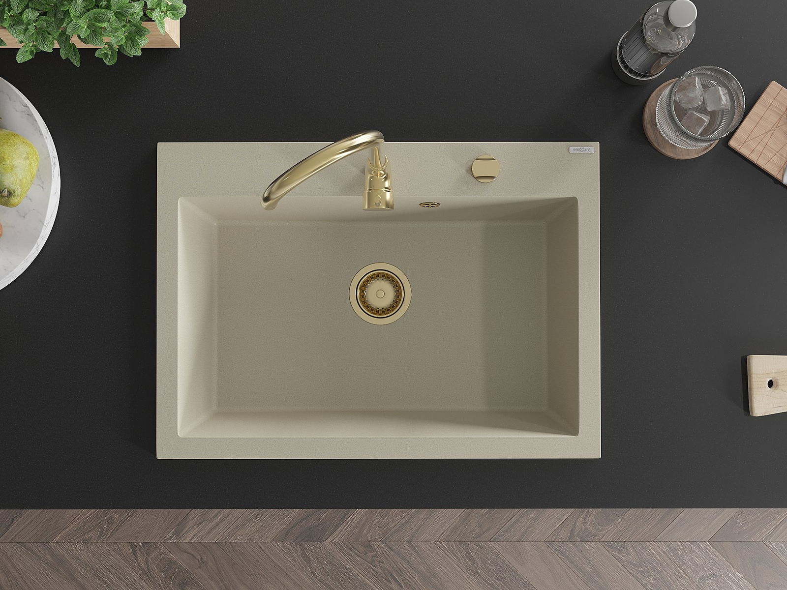 Mexen Elix zlewozmywak granitowy 1-komorowy 700 x 500 mm, beżowy, syfon złoty - 6526701005-69-G