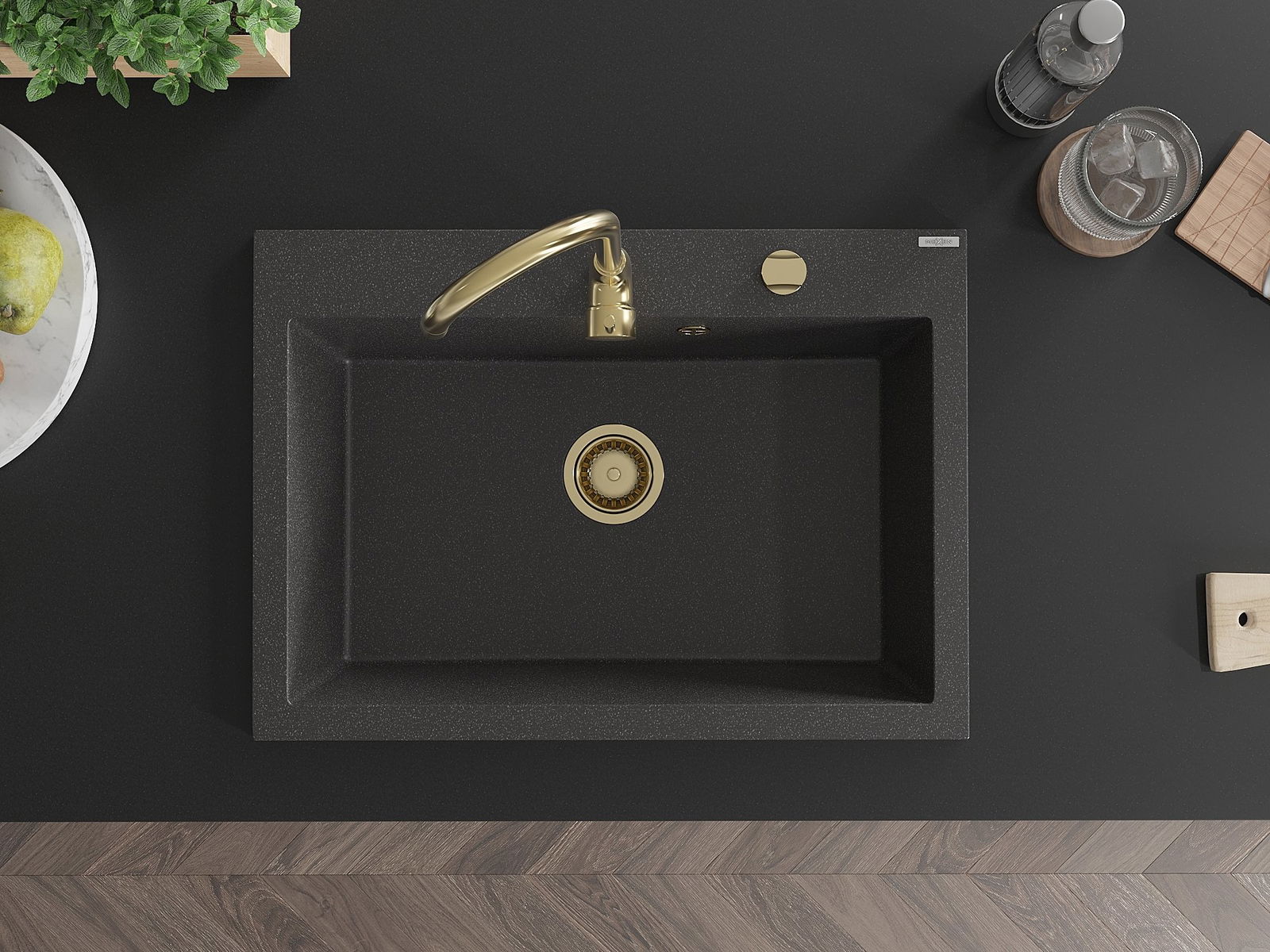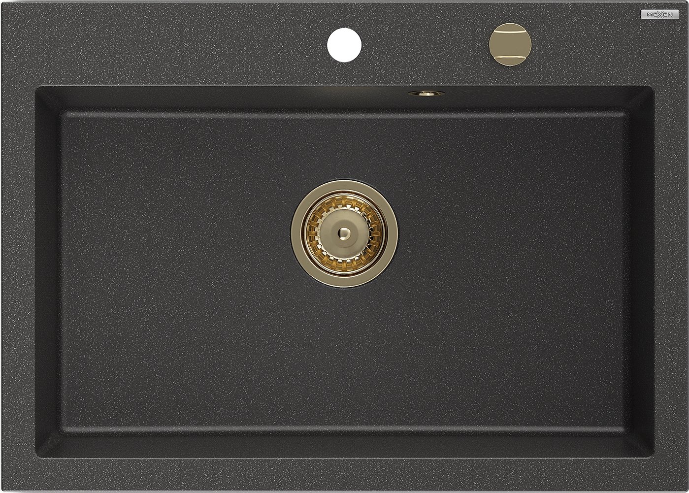 Mexen Elix zlewozmywak granitowy 1-komorowy 700 x 500 mm, czarny nakrapiany, syfon złoty - 6526701005-76-G