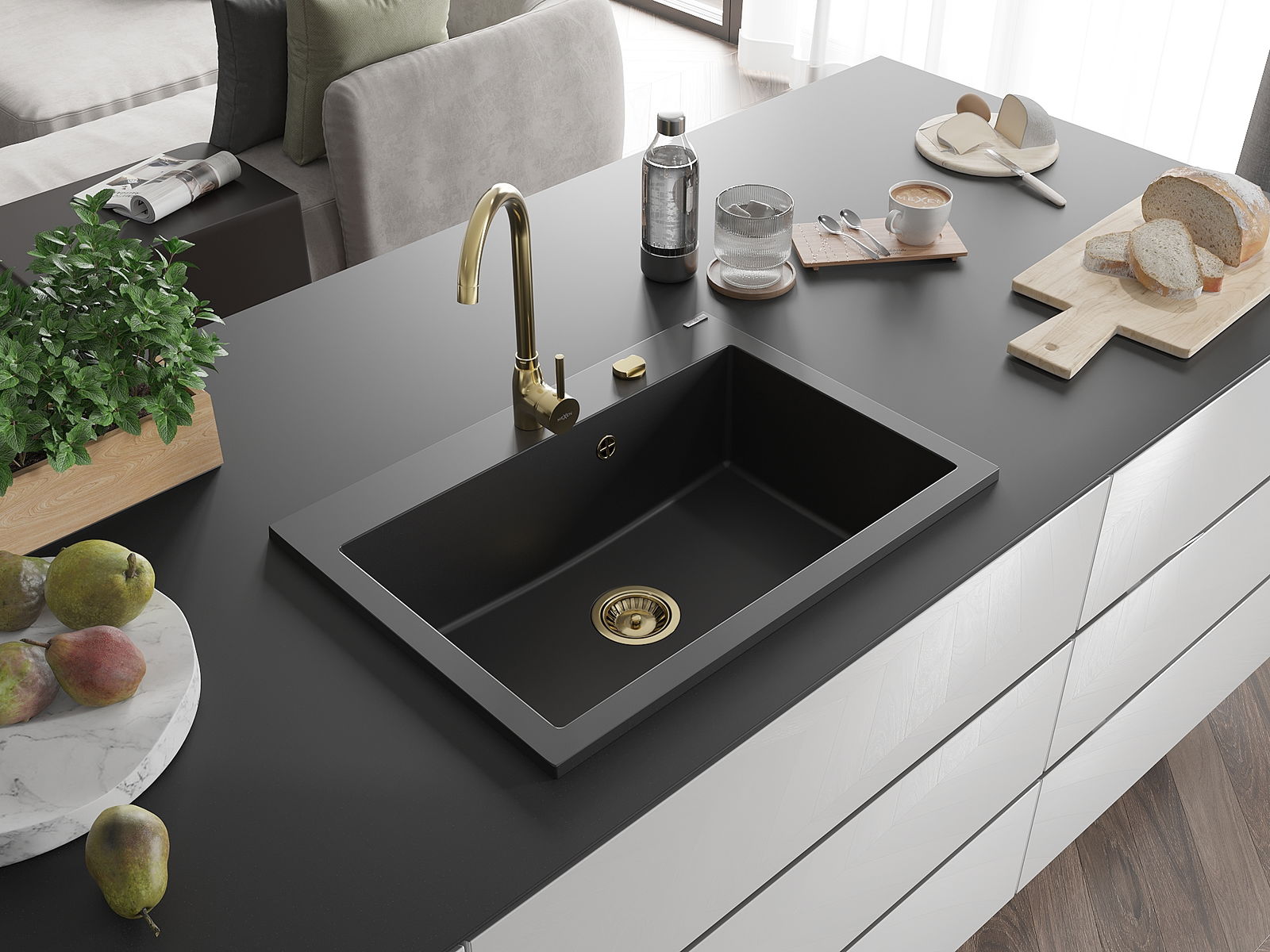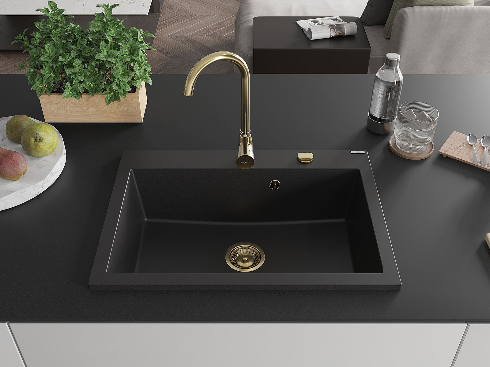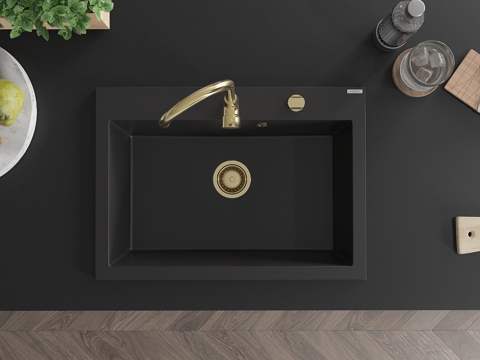 Mexen Elix zlewozmywak granitowy 1-komorowy 700 x 500 mm, czarny, syfon złoty - 6526701005-77-G
