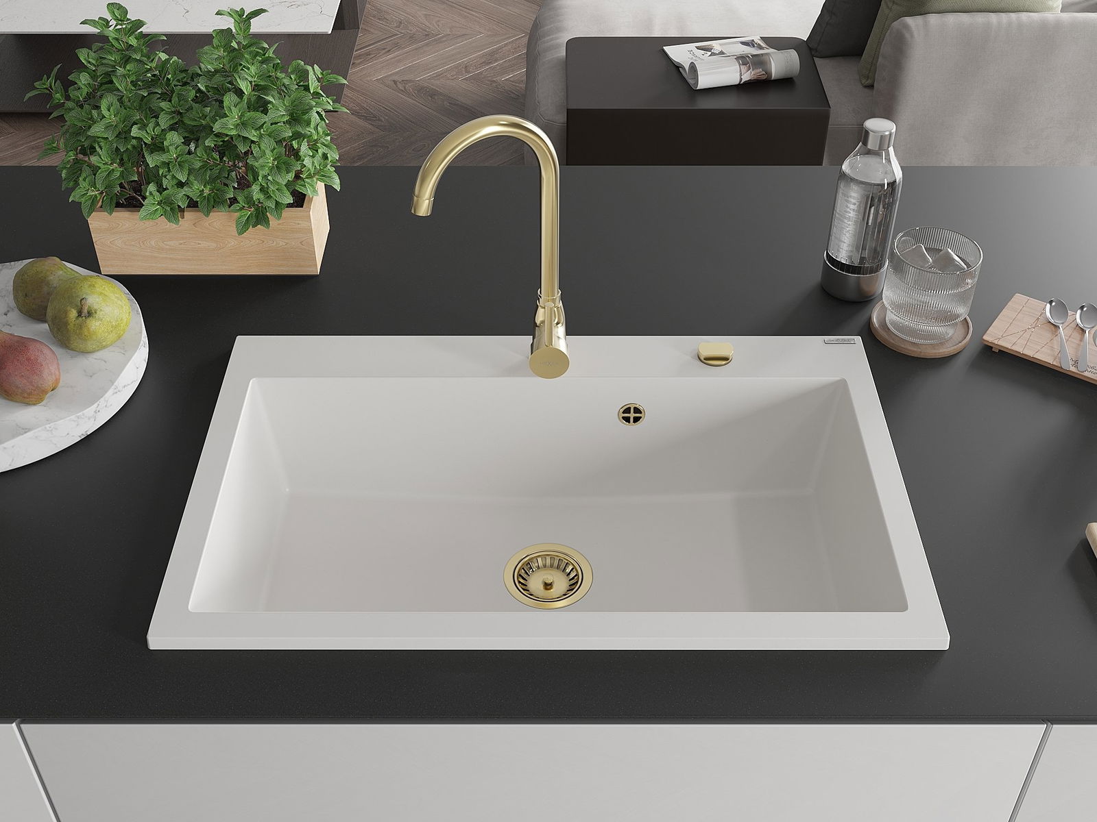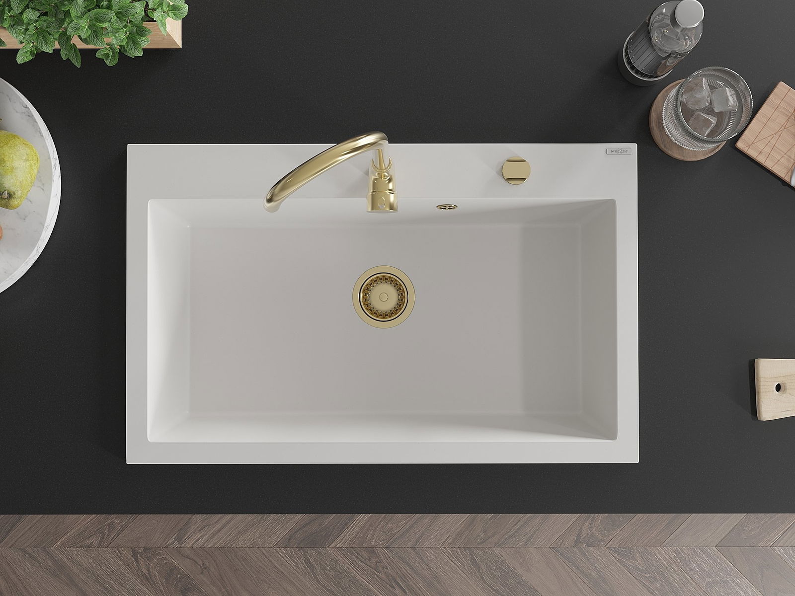 Mexen Elix zlewozmywak granitowy 1-komorowy 800 x 500 mm, biały, syfon złoty - 6527801005-20-G