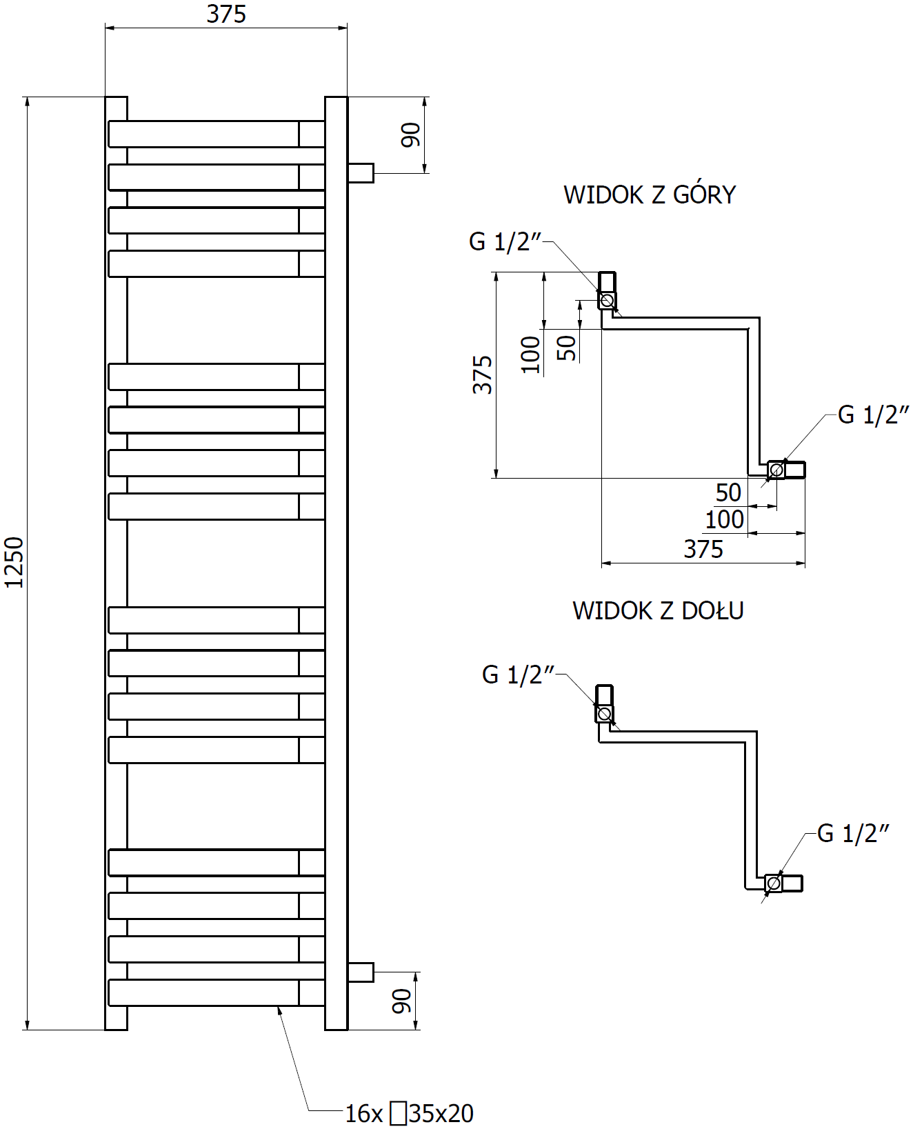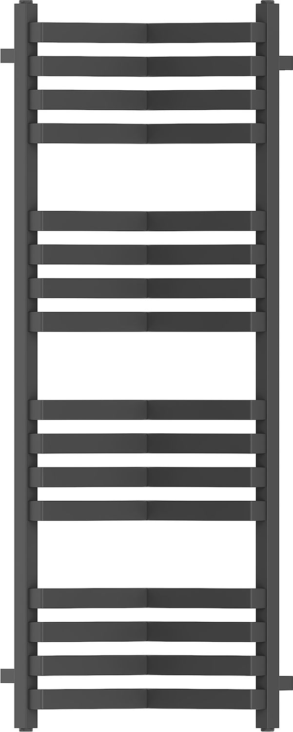 Dane techniczne: Wysokość: 1250 mm Szerokość: 375 mm Głębokość: 375 mm Rozstaw podłączenia: - 45 cm (dolne) Kolor: Antracyt RAL 7016 Materiał: Stal Waga: 15,09 kg Reakcja na ogień: A1 Temperatura pracy: max 95 °C  Maksymalne ciśnienie robocze: 0,6 Mpa Moc grzewcza: - 75/65/20 °C - 666 W Przyłącza: - 4xG ½″ od góry oraz dołu z prawej lub lewej strony Możliwość zamontowania grzałki Wysokiej jakości, trwała powłoka lakiernicza odporna na korozję W komplecie: zawieszenia, zestaw montażowy, korki zaślepiające oraz odpowietrznik
