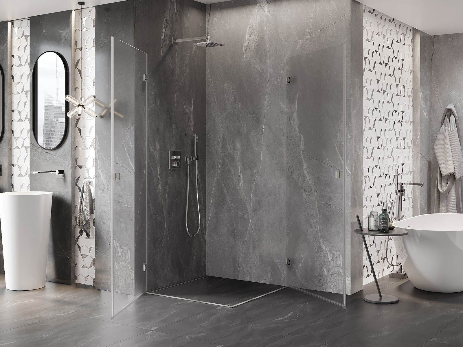 Poręczny i wygodny uchwyt został wykonany z trwałego i odpornego metalu. Modny kształt w połączeniu z wykończeniem dopasowanym do koloru profili nadaje całości nowoczesnego i stylowego wyglądu, podkreślając estetykę każdej łazienki.
