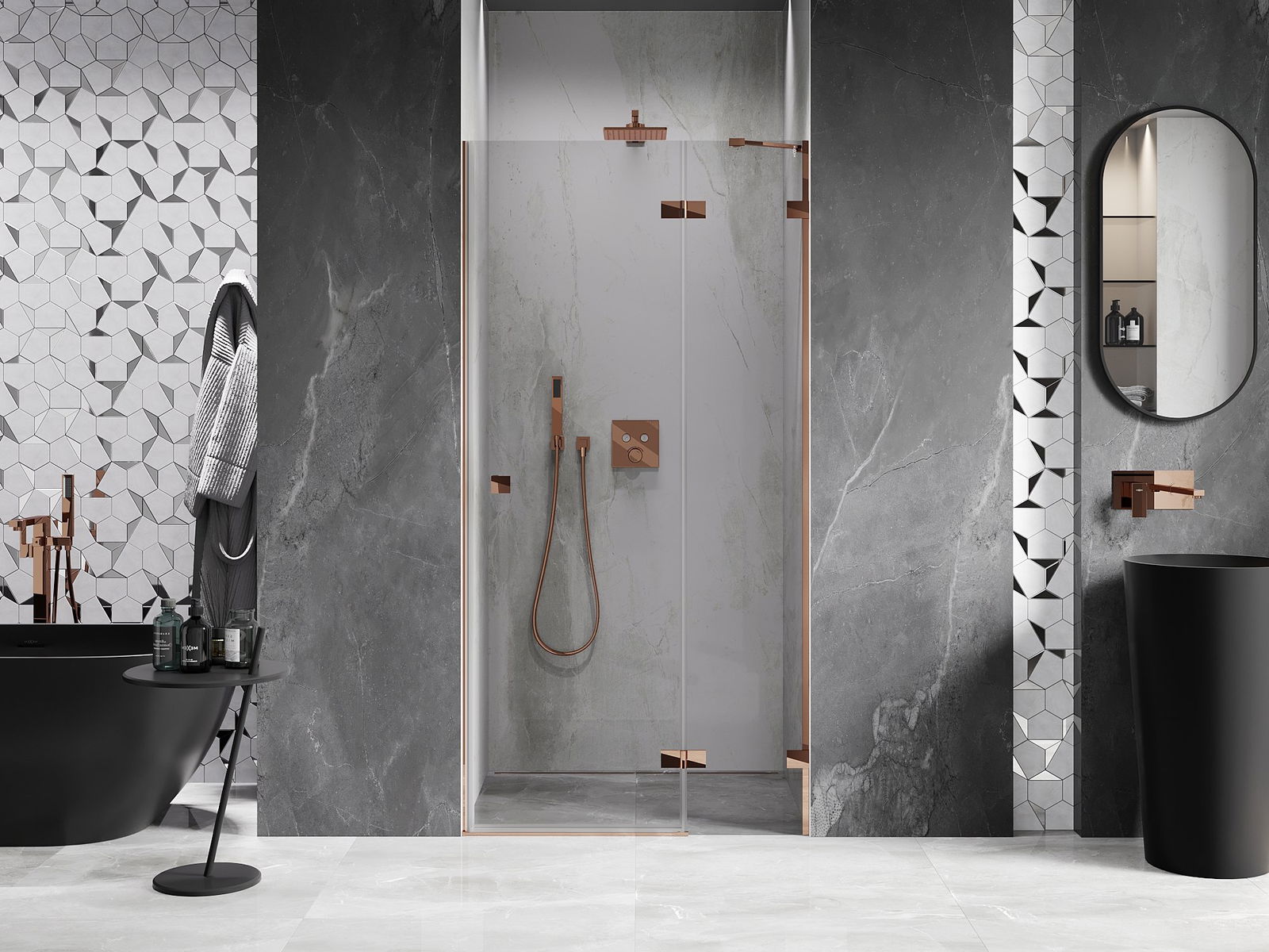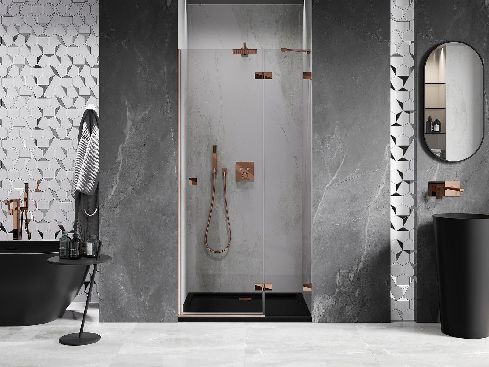 Poręczny i wygodny uchwyt został wykonany z trwałego i odpornego metalu. Modny kształt w połączeniu z wykończeniem dopasowanym do koloru profili nadaje całości nowoczesnego i stylowego wyglądu, podkreślając estetykę każdej łazienki.