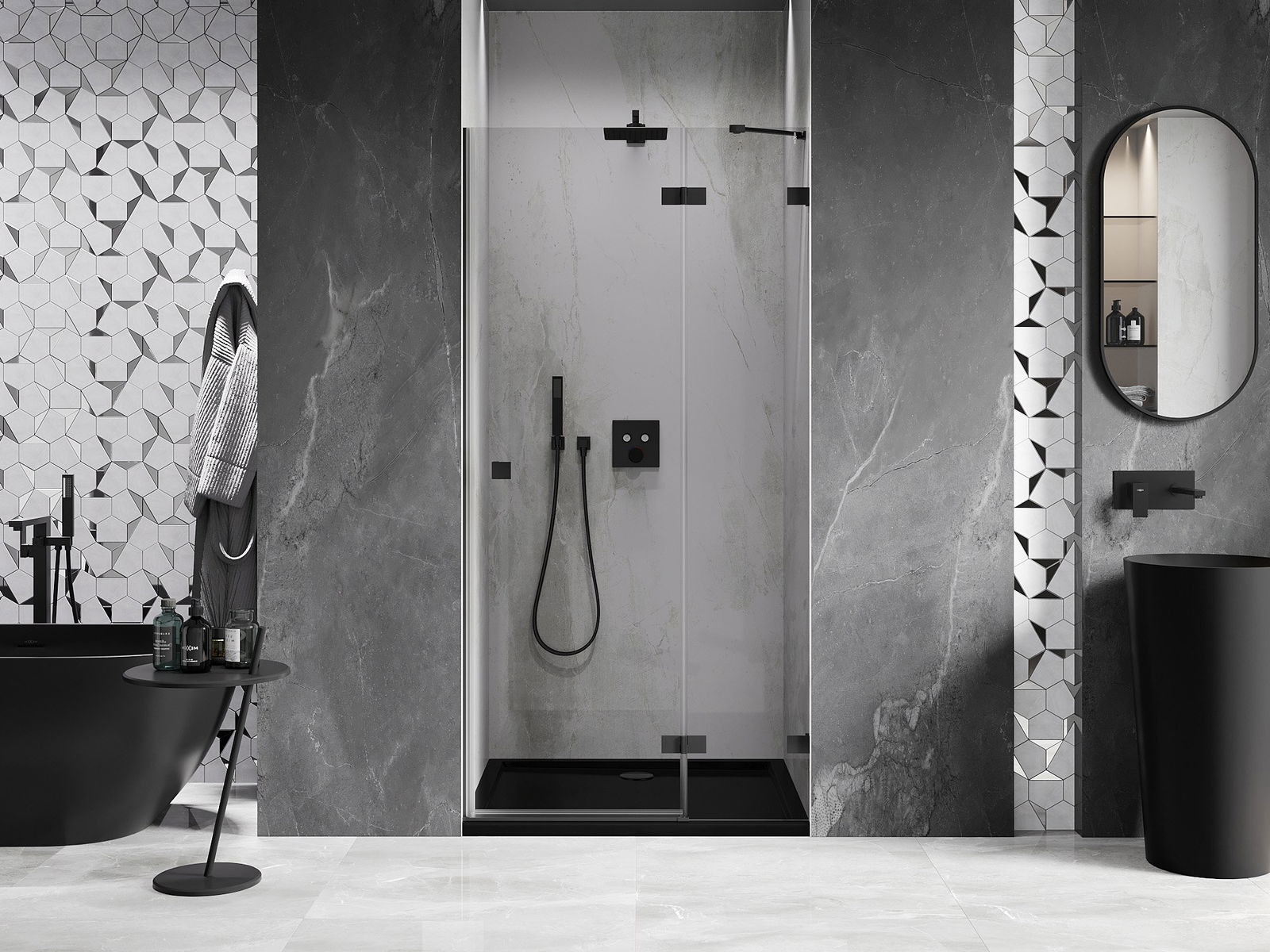 Poręczny i wygodny uchwyt został wykonany z trwałego i odpornego metalu. Modny kształt w połączeniu z wykończeniem dopasowanym do koloru profili nadaje całości nowoczesnego i stylowego wyglądu, podkreślając estetykę każdej łazienki.
