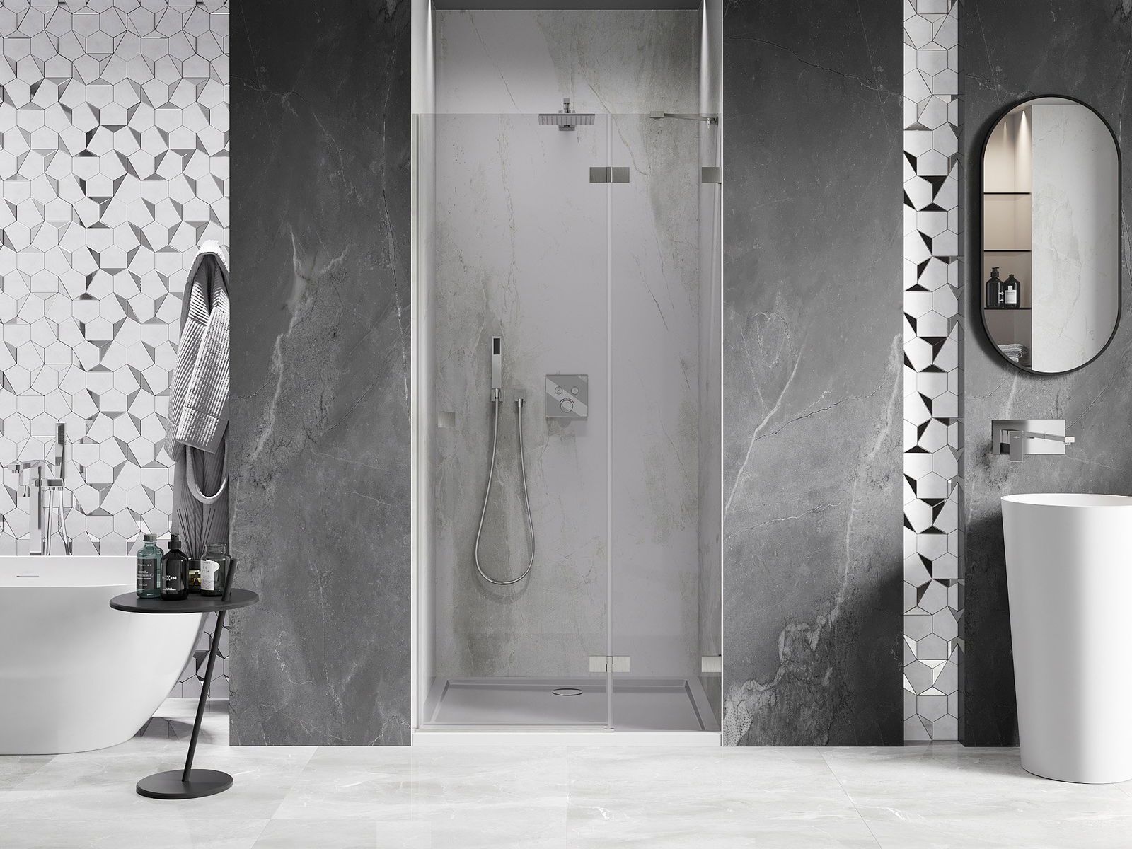 Poręczny i wygodny uchwyt został wykonany z trwałego i odpornego metalu. Modny kształt w połączeniu z wykończeniem dopasowanym do koloru profili nadaje całości nowoczesnego i stylowego wyglądu, podkreślając estetykę każdej łazienki.
