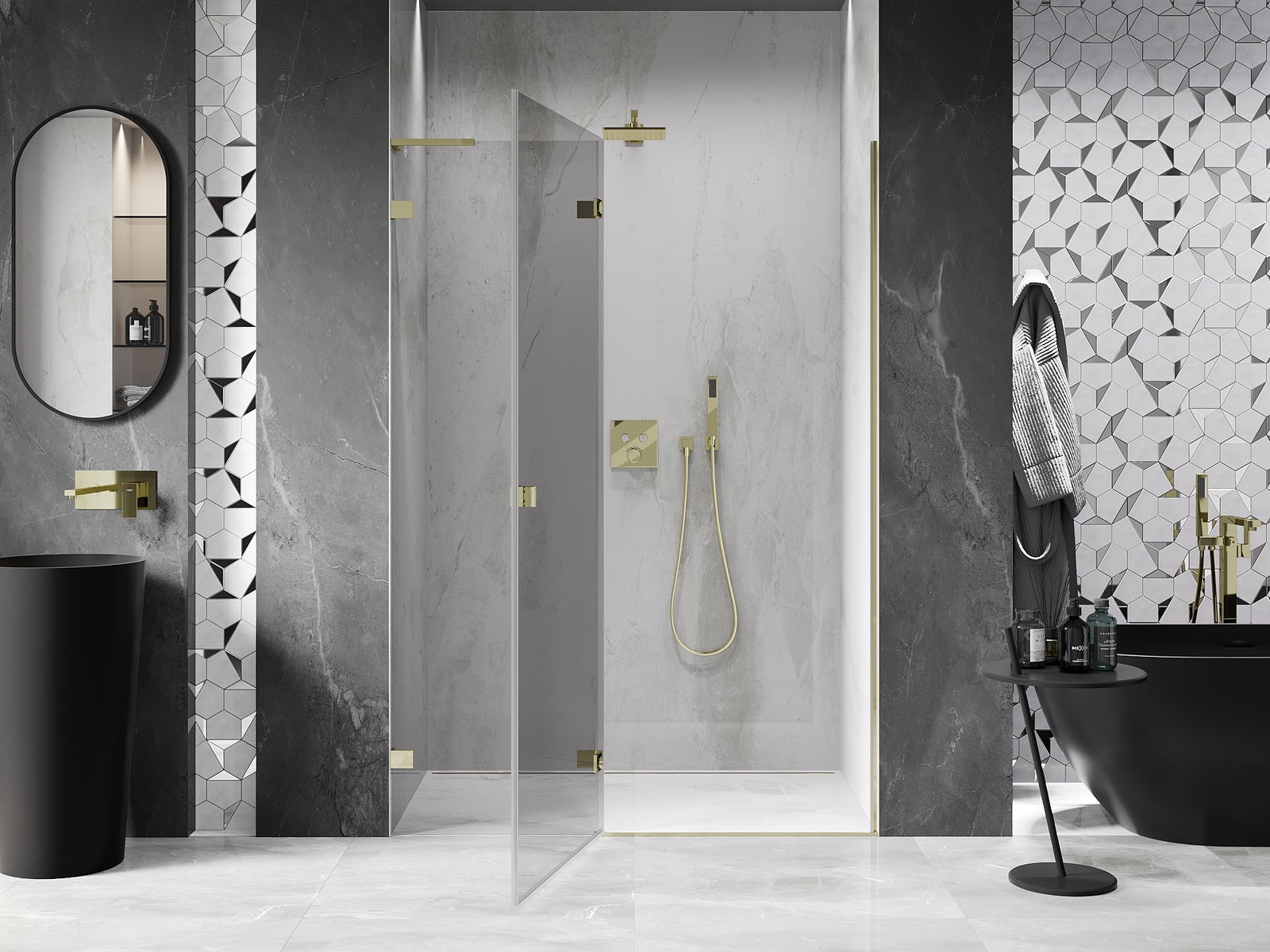Klamry i zawiasy zostały wykonane z bardzo trwałego mosiądzu, a dodatkowo tworzą zlicowaną taflę szkła. Jest to doskonały wybór, który łączy elegancję, trwałość i nowoczesny design. Dzięki takim rozwiązaniom prysznic zyskuje na estetyce, a jednocześnie ułatwiają utrzymanie czystości.