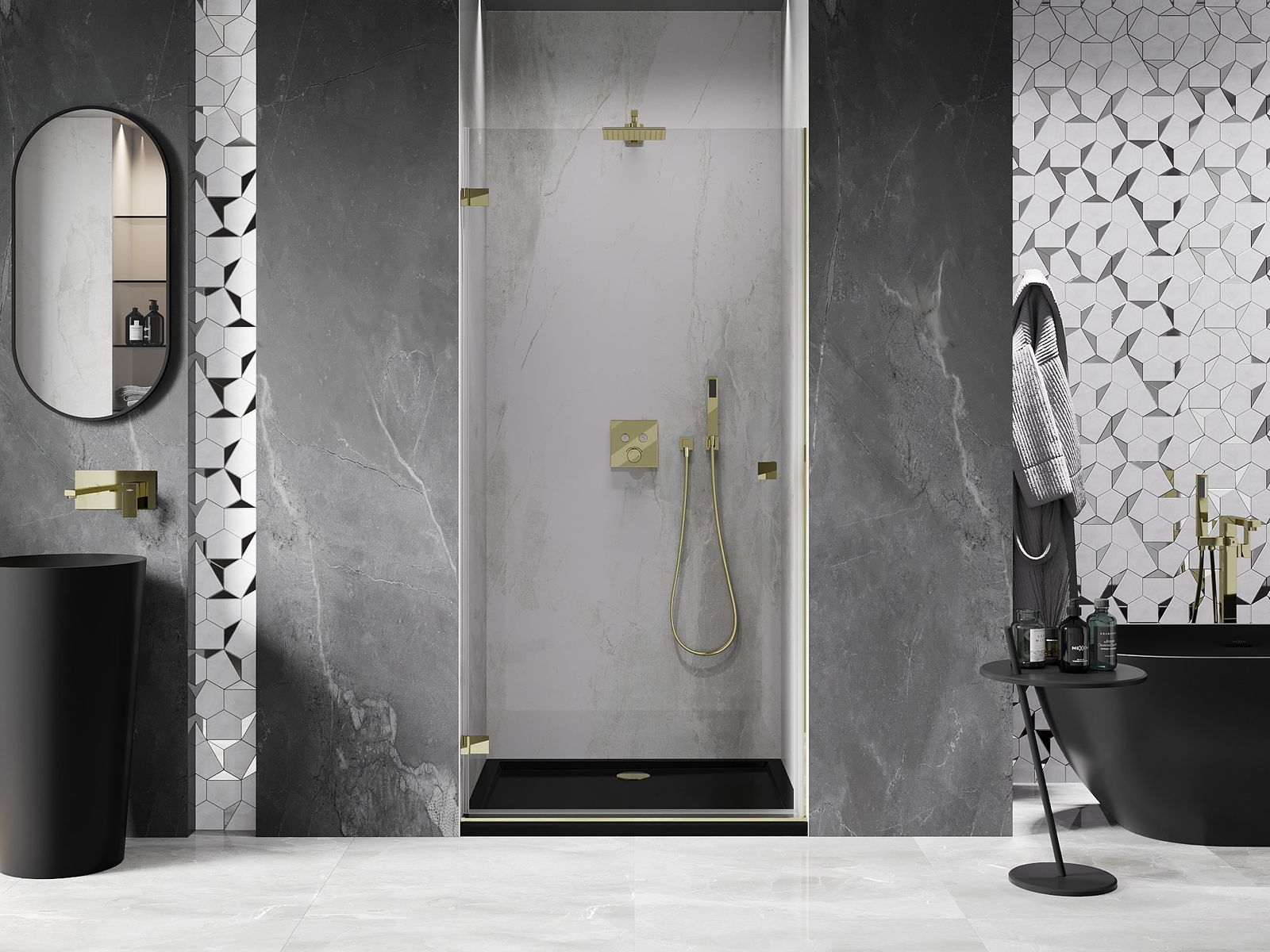 Poręczny i wygodny uchwyt został wykonany z trwałego i odpornego metalu. Modny kształt w połączeniu z wykończeniem dopasowanym do koloru profili nadaje całości nowoczesnego i stylowego wyglądu, podkreślając estetykę każdej łazienki.