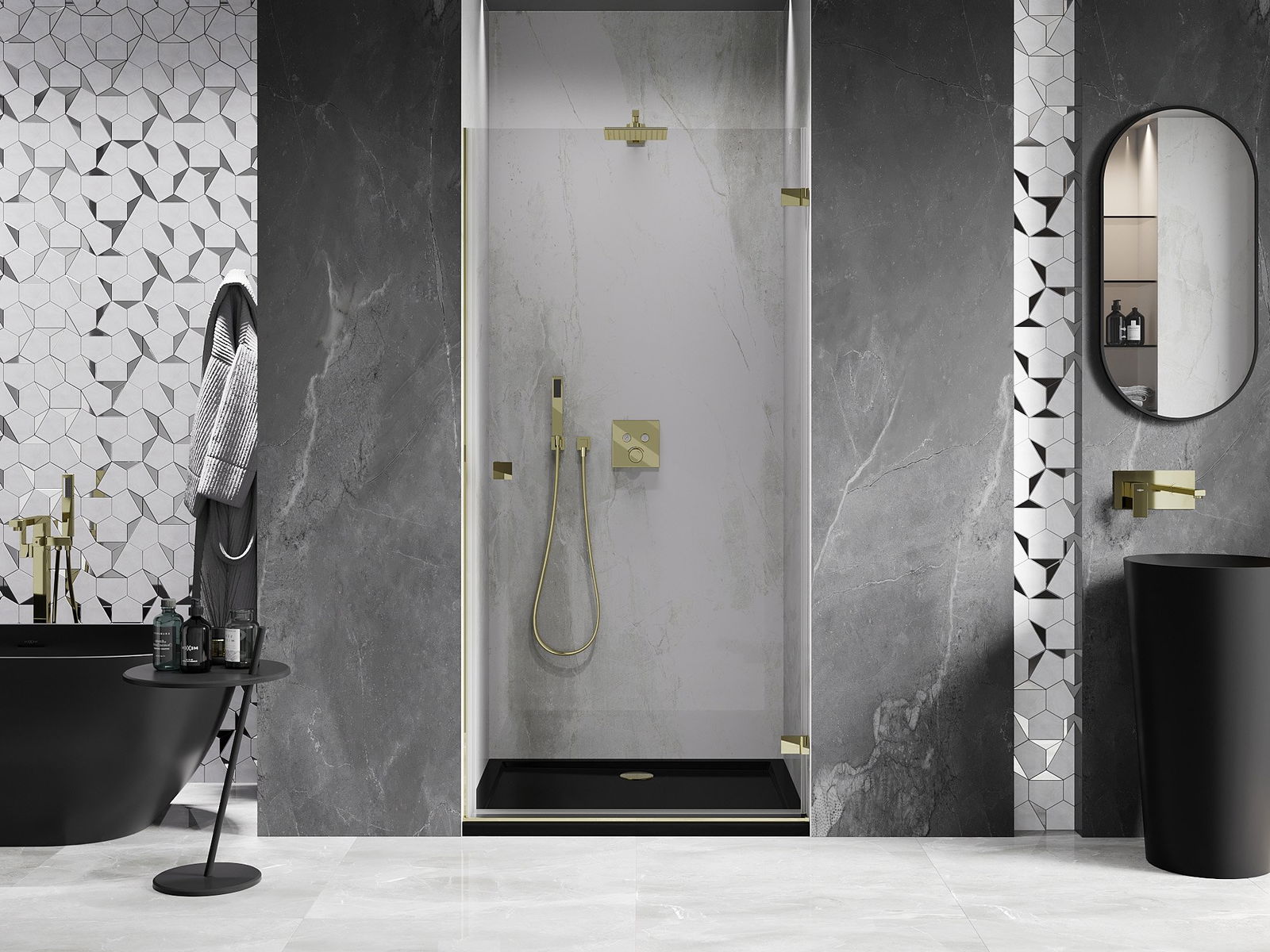Poręczny i wygodny uchwyt został wykonany z trwałego i odpornego metalu. Modny kształt w połączeniu z wykończeniem dopasowanym do koloru profili nadaje całości nowoczesnego i stylowego wyglądu, podkreślając estetykę każdej łazienki.