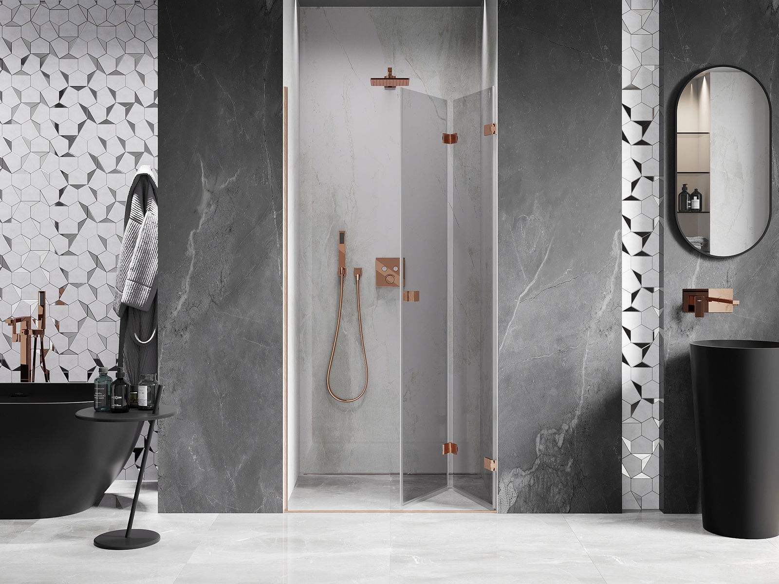 Możliwość składania drzwi, zarówno do zewnątrz, jak i do wewnątrz, pozwala uzyskać więcej przestrzeni podczas niekorzystania z prysznica. Jest to idealne rozwiązanie do mniejszych łazienek, maksymalnie wykorzystujące dostępną powierzchnię.