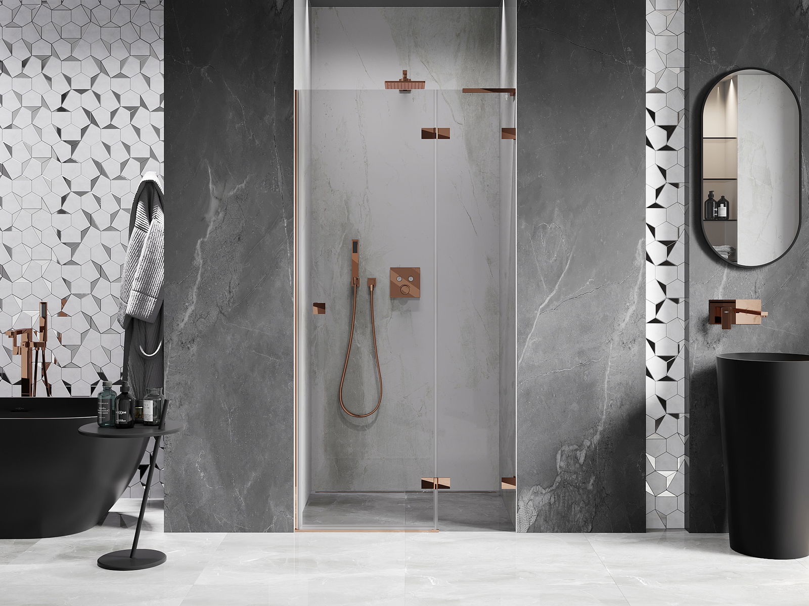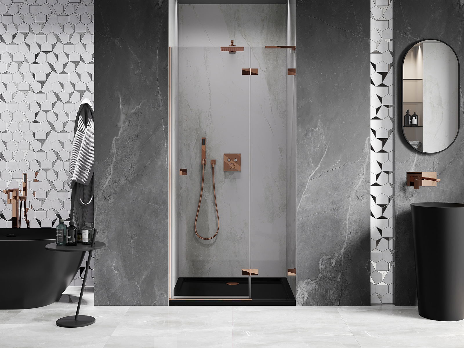 Klamry i zawiasy zostały wykonane z bardzo trwałego mosiądzu, a dodatkowo tworzą zlicowaną taflę szkła. Jest to doskonały wybór, który łączy elegancję, trwałość i nowoczesny design. Dzięki takim rozwiązaniom prysznic zyskuje na estetyce, a jednocześnie ułatwiają utrzymanie czystości.
