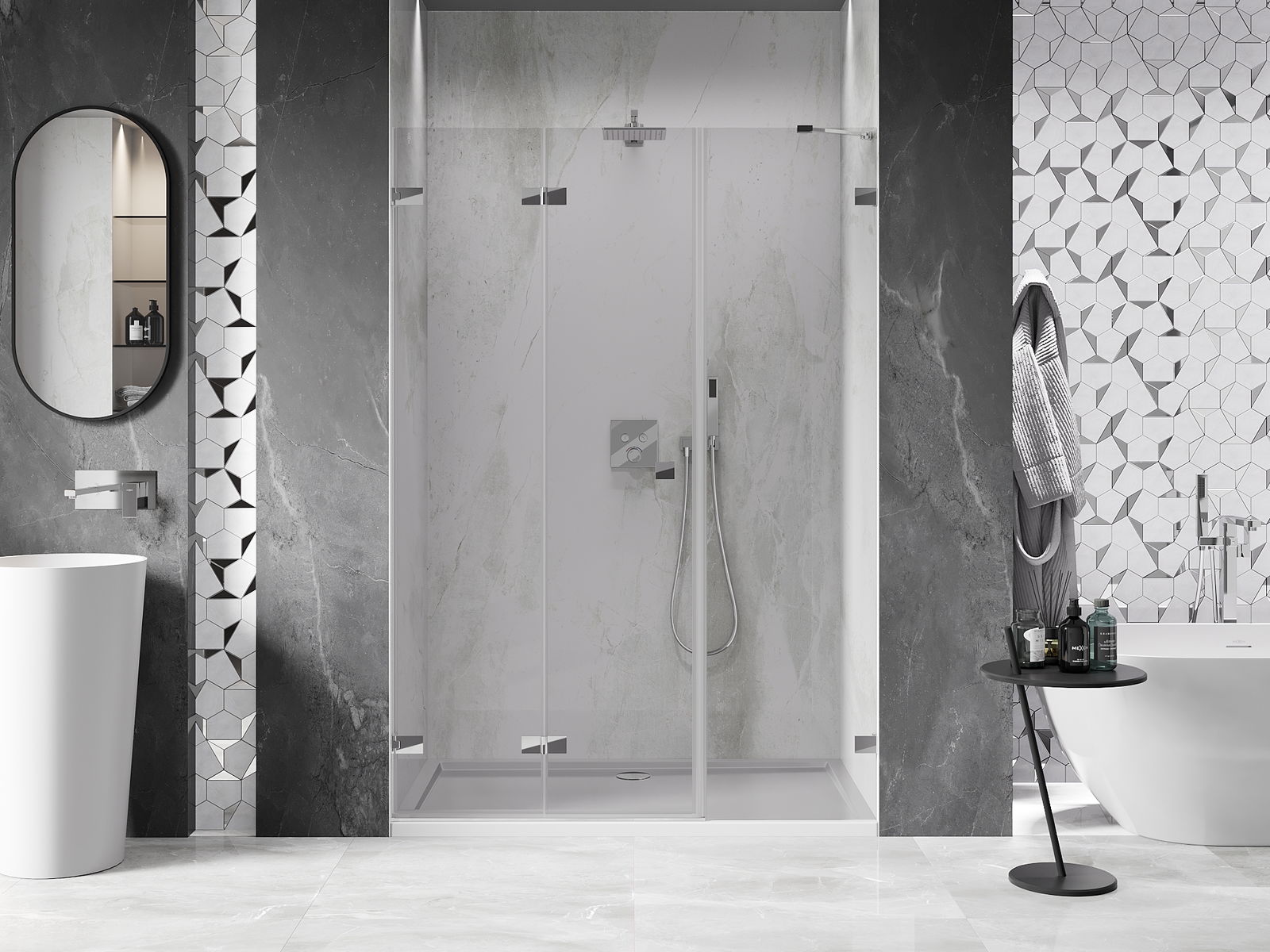 Możliwość składania drzwi, zarówno do zewnątrz, jak i do wewnątrz, pozwala uzyskać więcej przestrzeni podczas niekorzystania z prysznica. Jest to idealne rozwiązanie do mniejszych łazienek, maksymalnie wykorzystujące dostępną powierzchnię.