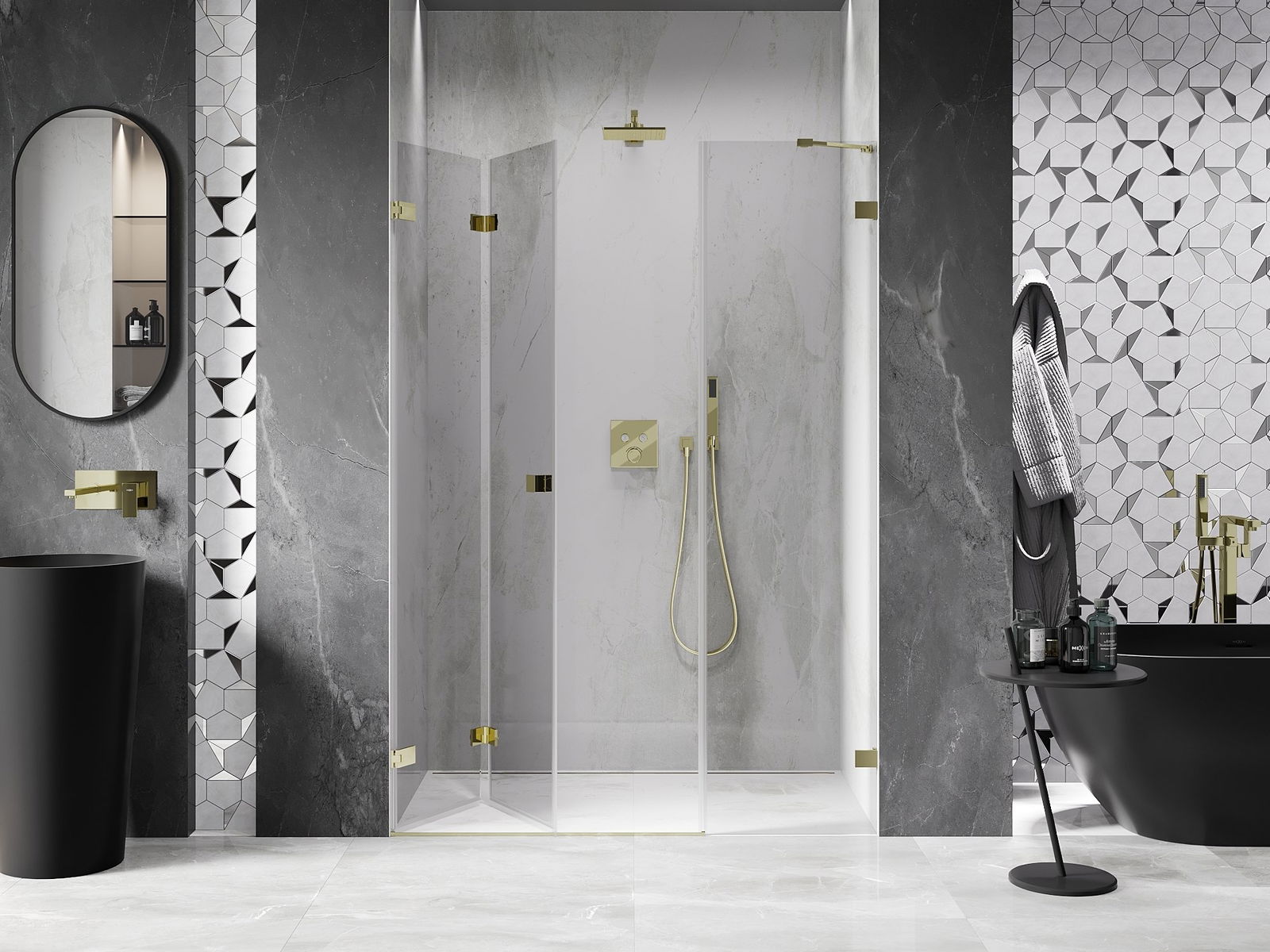 Możliwość składania drzwi, zarówno do zewnątrz, jak i do wewnątrz, pozwala uzyskać więcej przestrzeni podczas niekorzystania z prysznica. Jest to idealne rozwiązanie do mniejszych łazienek, maksymalnie wykorzystujące dostępną powierzchnię.