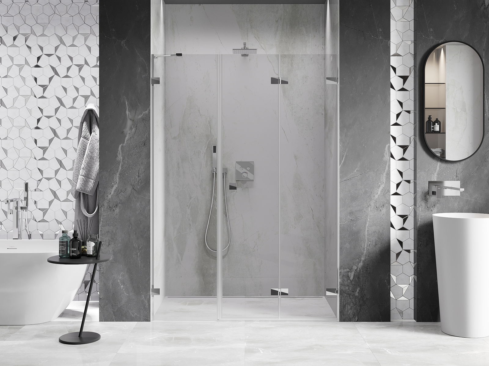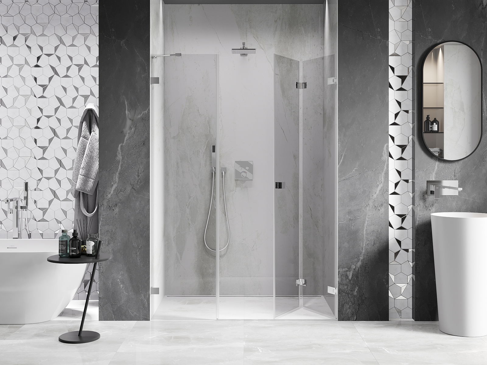 Możliwość składania drzwi, zarówno do zewnątrz, jak i do wewnątrz, pozwala uzyskać więcej przestrzeni podczas niekorzystania z prysznica. Jest to idealne rozwiązanie do mniejszych łazienek, maksymalnie wykorzystujące dostępną powierzchnię.