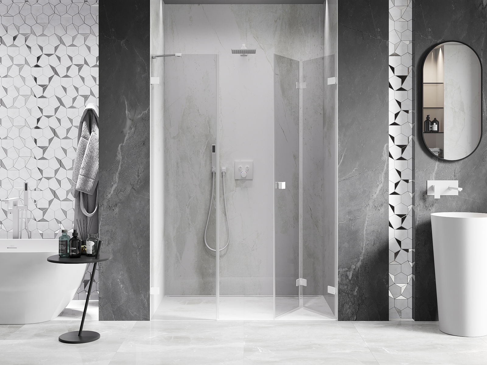 Możliwość składania drzwi, zarówno do zewnątrz, jak i do wewnątrz, pozwala uzyskać więcej przestrzeni podczas niekorzystania z prysznica. Jest to idealne rozwiązanie do mniejszych łazienek, maksymalnie wykorzystujące dostępną powierzchnię.