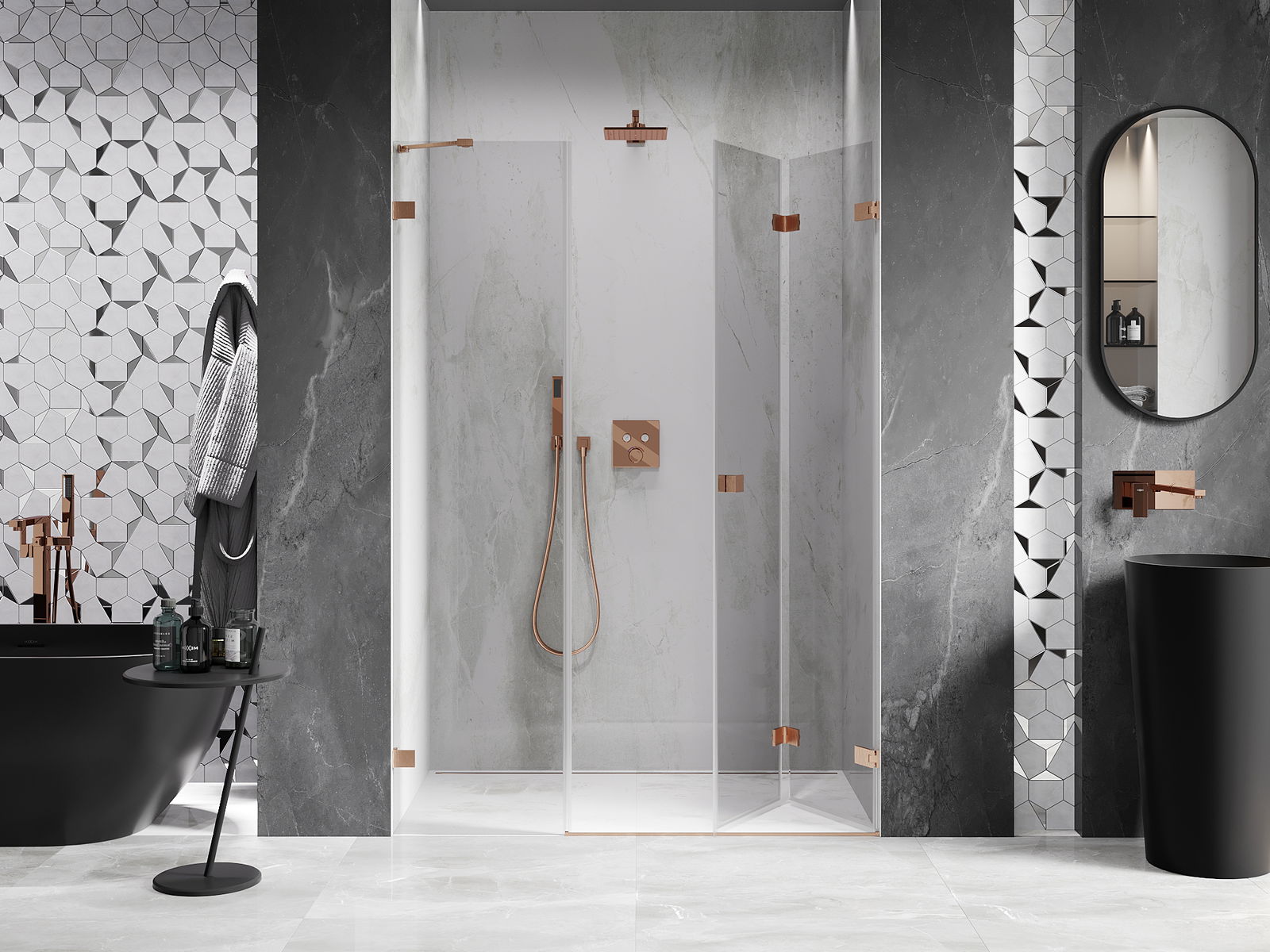 Możliwość składania drzwi, zarówno do zewnątrz, jak i do wewnątrz, pozwala uzyskać więcej przestrzeni podczas niekorzystania z prysznica. Jest to idealne rozwiązanie do mniejszych łazienek, maksymalnie wykorzystujące dostępną powierzchnię.