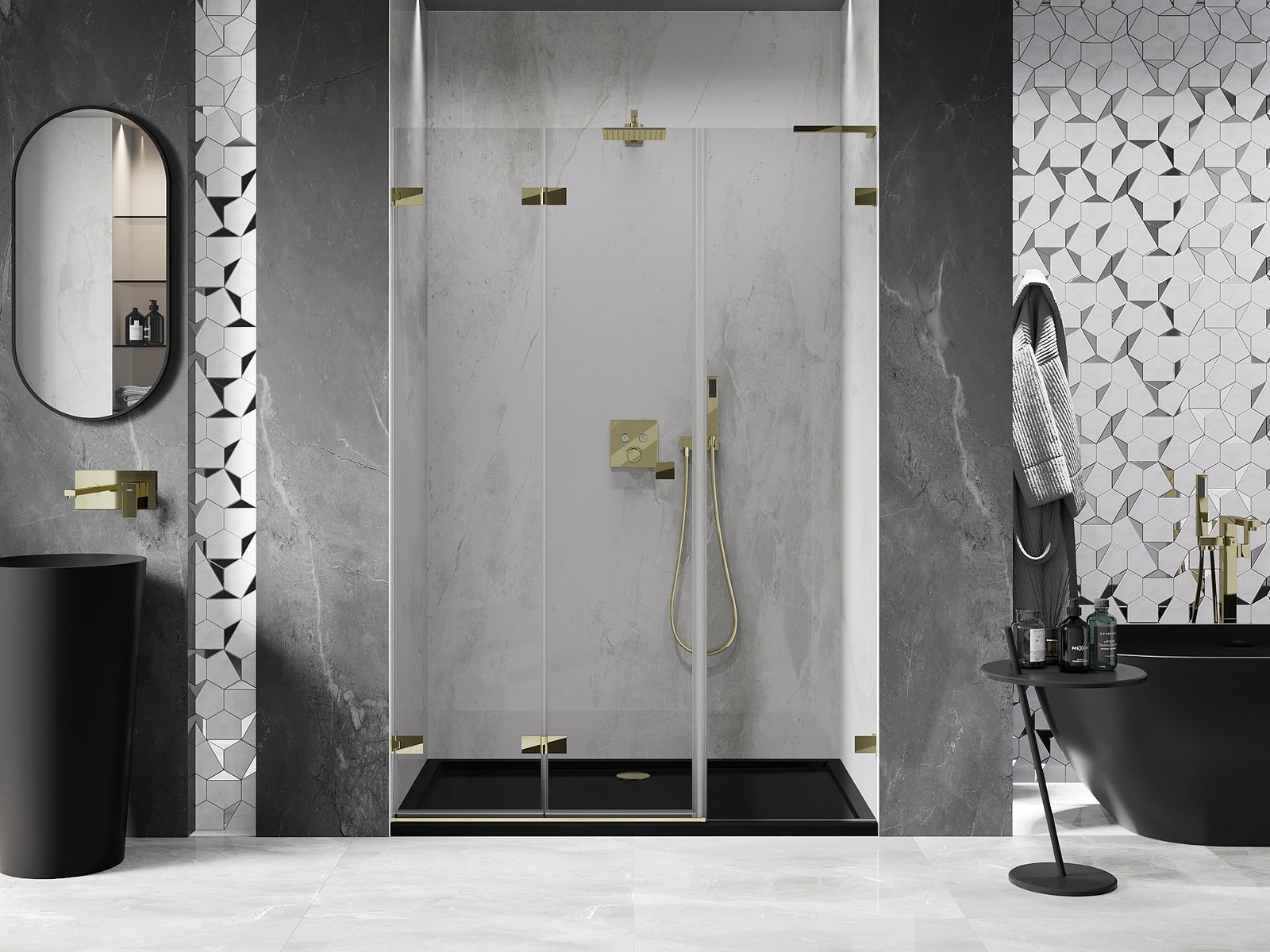 Możliwość składania drzwi, zarówno do zewnątrz, jak i do wewnątrz, pozwala uzyskać więcej przestrzeni podczas niekorzystania z prysznica. Jest to idealne rozwiązanie do mniejszych łazienek, maksymalnie wykorzystujące dostępną powierzchnię.