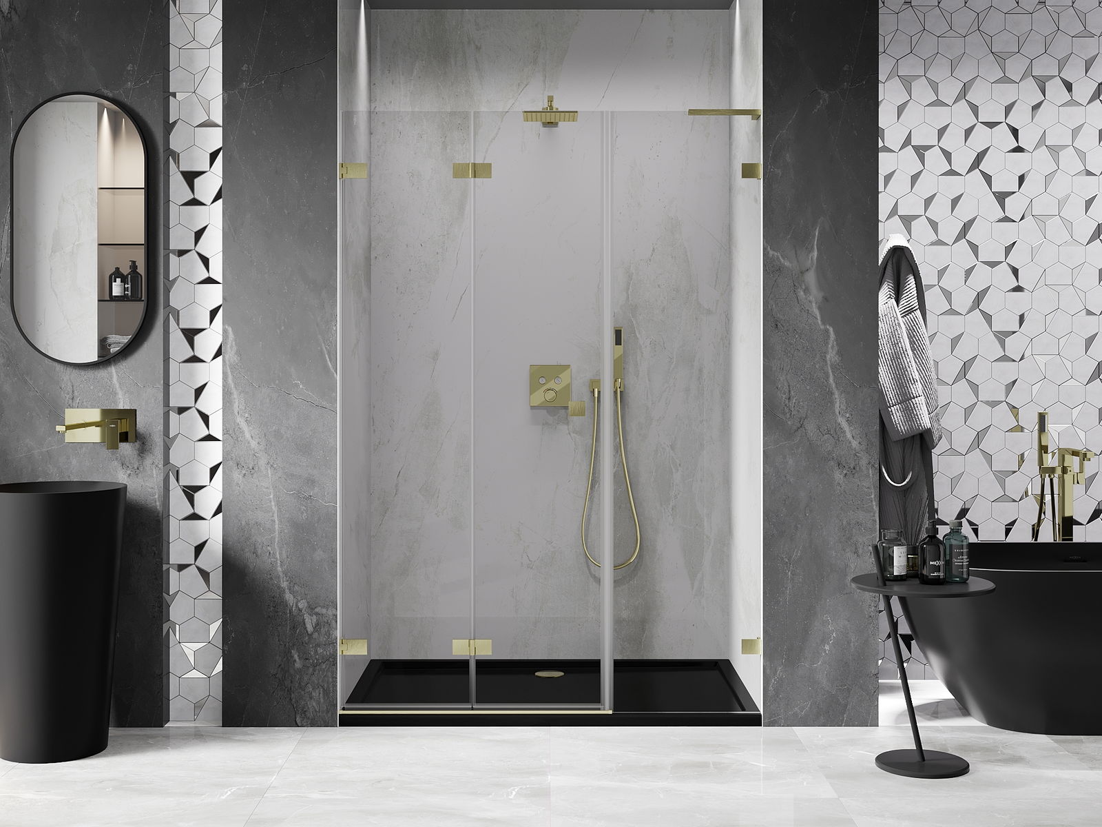 Możliwość składania drzwi, zarówno do zewnątrz, jak i do wewnątrz, pozwala uzyskać więcej przestrzeni podczas niekorzystania z prysznica. Jest to idealne rozwiązanie do mniejszych łazienek, maksymalnie wykorzystujące dostępną powierzchnię.