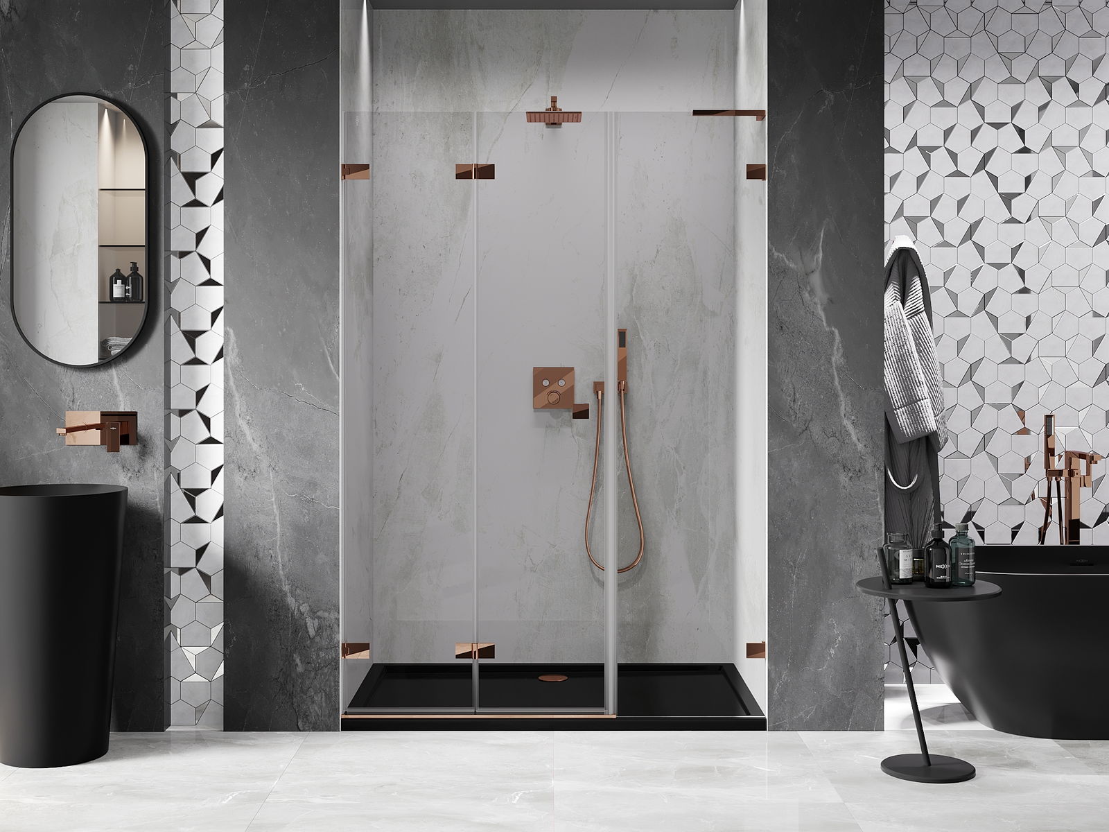 Możliwość składania drzwi, zarówno do zewnątrz, jak i do wewnątrz, pozwala uzyskać więcej przestrzeni podczas niekorzystania z prysznica. Jest to idealne rozwiązanie do mniejszych łazienek, maksymalnie wykorzystujące dostępną powierzchnię.