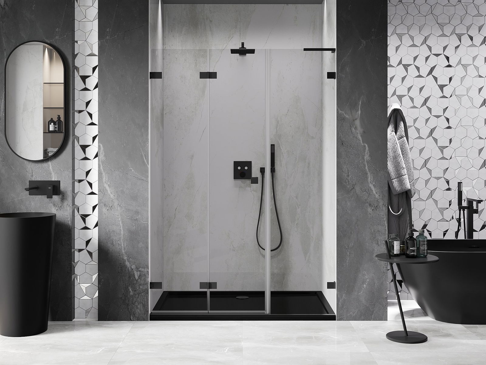 Możliwość składania drzwi, zarówno do zewnątrz, jak i do wewnątrz, pozwala uzyskać więcej przestrzeni podczas niekorzystania z prysznica. Jest to idealne rozwiązanie do mniejszych łazienek, maksymalnie wykorzystujące dostępną powierzchnię.