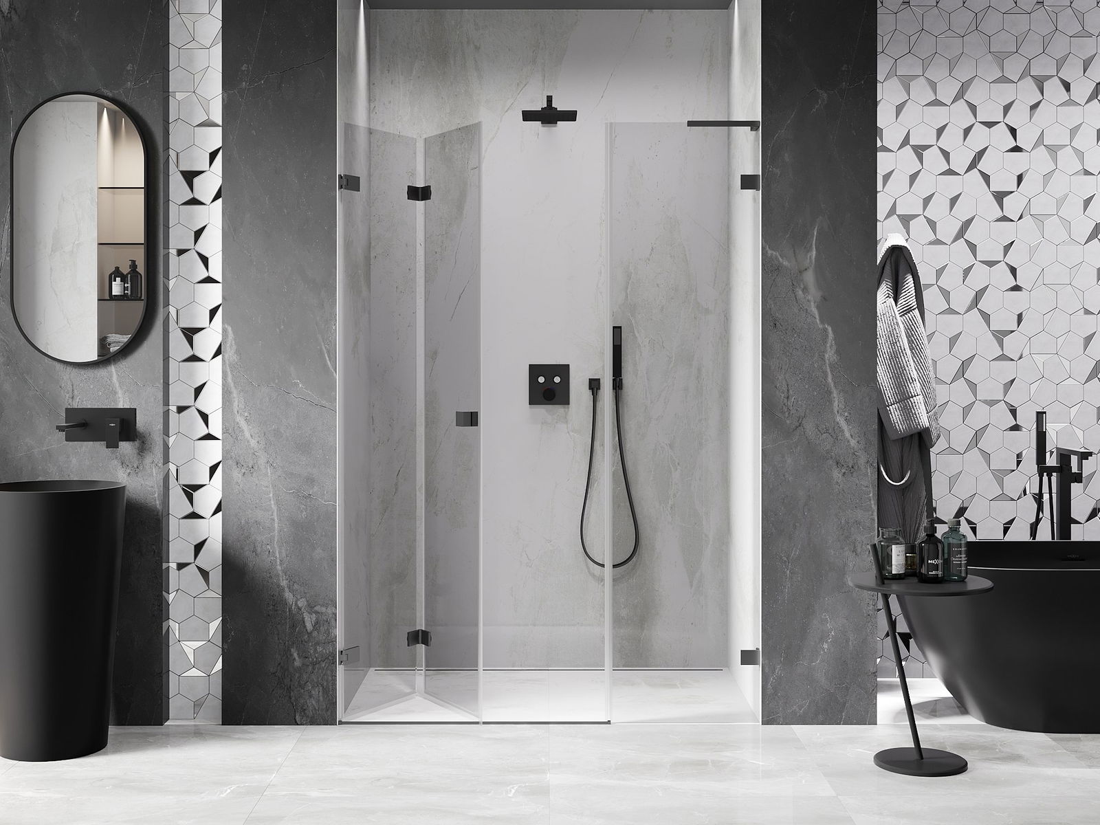 Możliwość składania drzwi, zarówno do zewnątrz, jak i do wewnątrz, pozwala uzyskać więcej przestrzeni podczas niekorzystania z prysznica. Jest to idealne rozwiązanie do mniejszych łazienek, maksymalnie wykorzystujące dostępną powierzchnię.