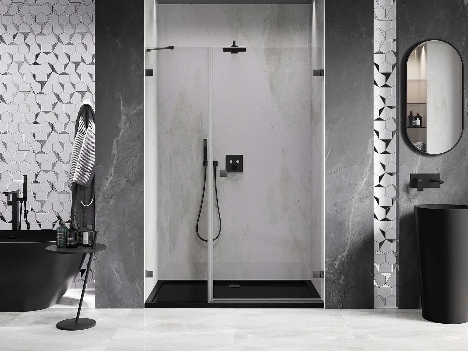 Poręczny i wygodny uchwyt został wykonany z trwałego i odpornego metalu. Modny kształt w połączeniu z wykończeniem dopasowanym do koloru profili nadaje całości nowoczesnego i stylowego wyglądu, podkreślając estetykę każdej łazienki.